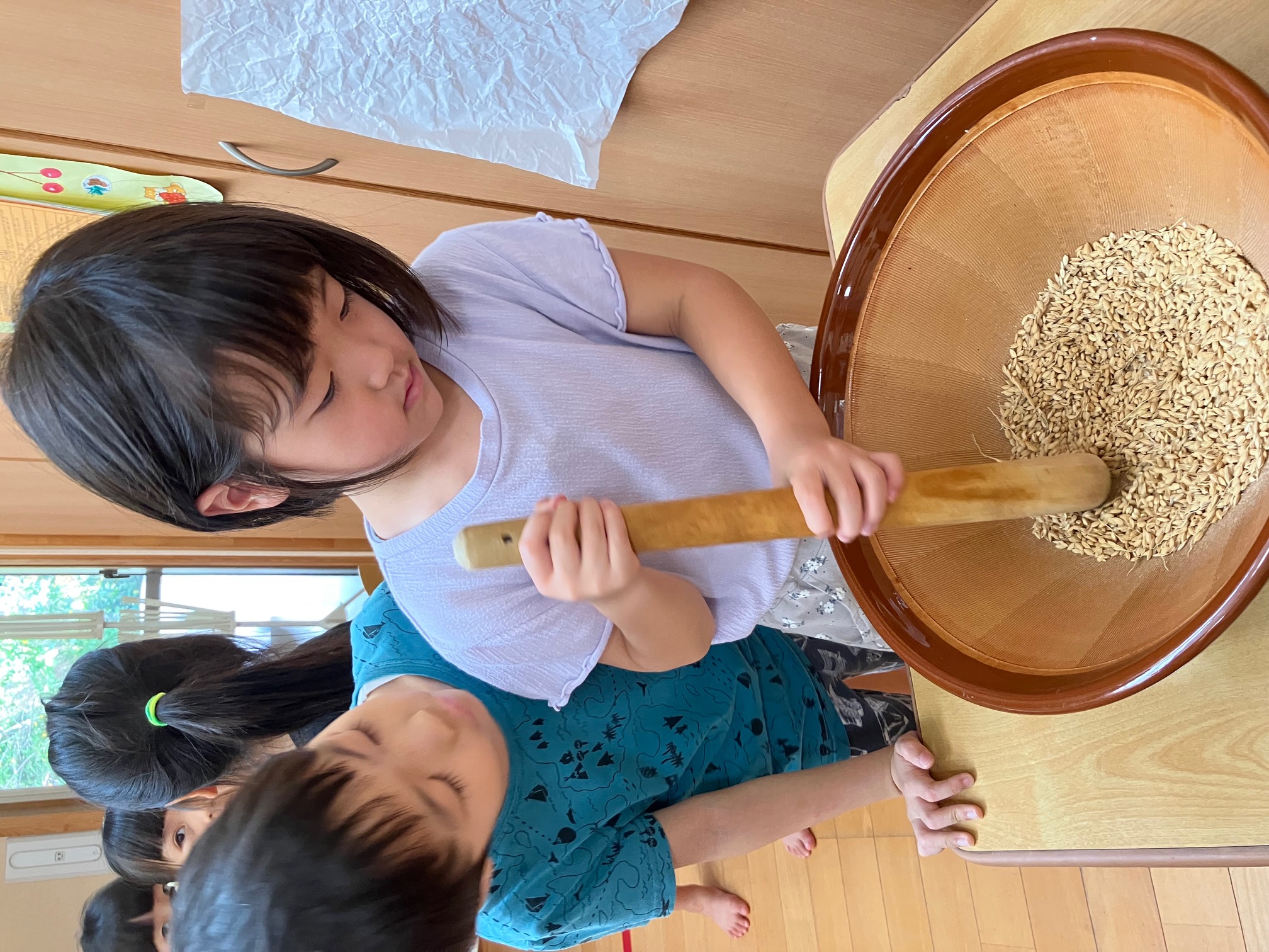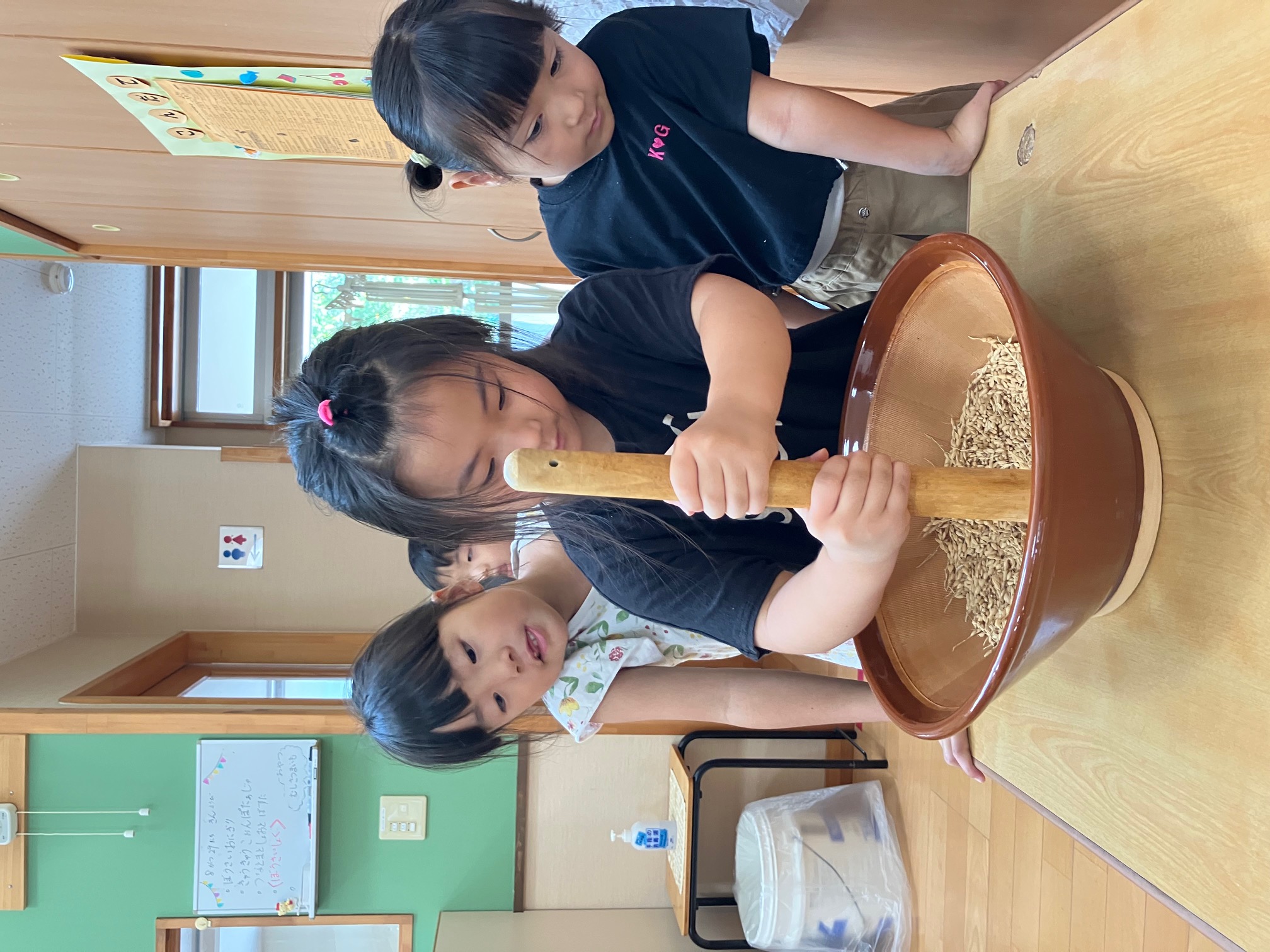 ひまわり組では、すり鉢とすりこぎを使い籾を精米し、玄米にしています。3カップ程の籾でも玄米にするためには何百回もする必要があり、少しづつコツコツと精米を続けています。 この玄米で『オニギリを作る!』目標を掲げているひまわり組さんです。 |