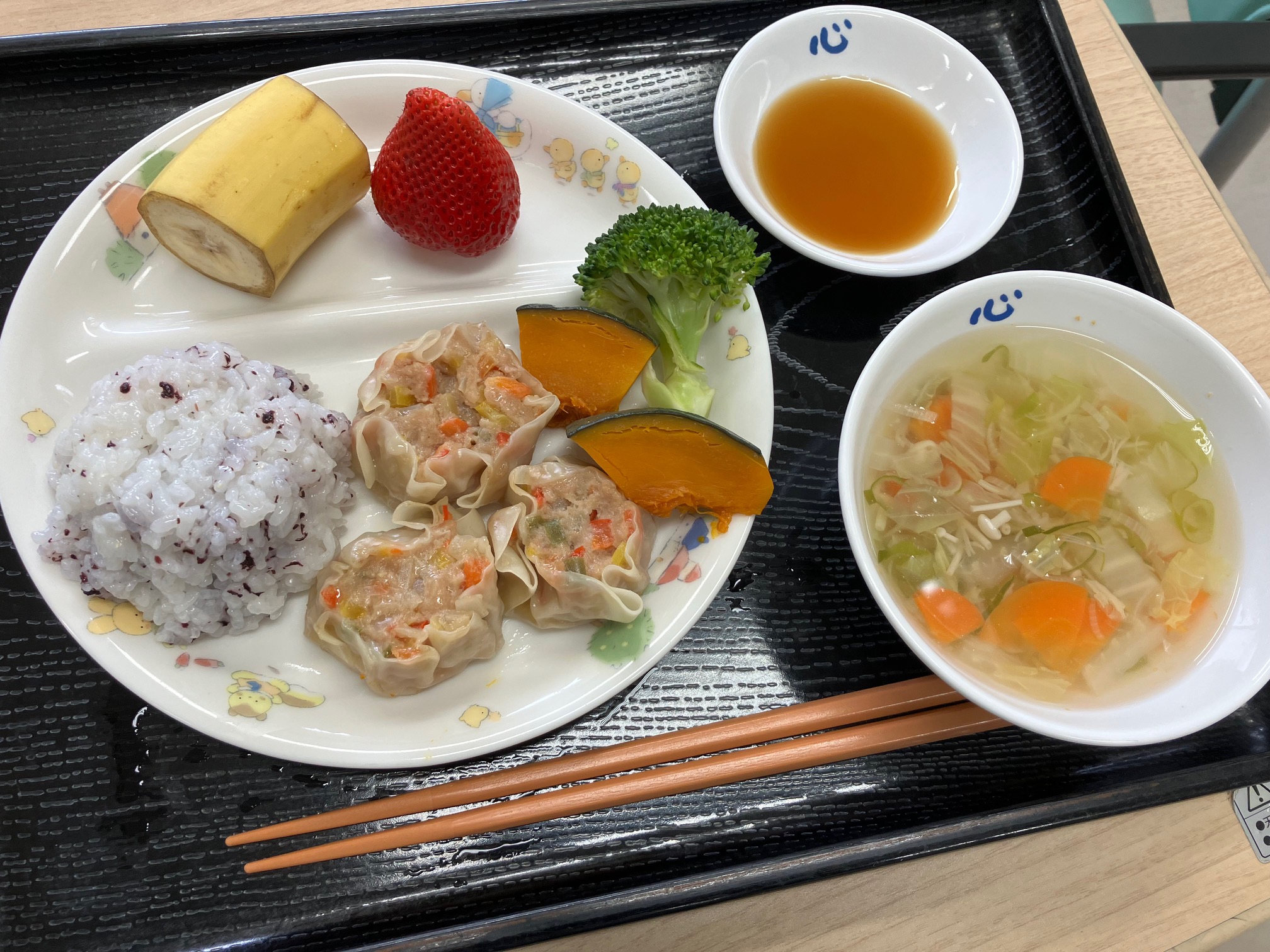 誕生会の給食メニューは、『ゆかりご飯、中華スープ、カラフルシュウマイ、蒸し野菜、いちご、バナナ』でした。 カラフルシュウマイは、子ども達のリクエストメニューです。シュウマイの中に赤・黄のパプリが沢山入っており、名前のごとくカラフルで味良し彩り良しで人気メニューの一つです。 |