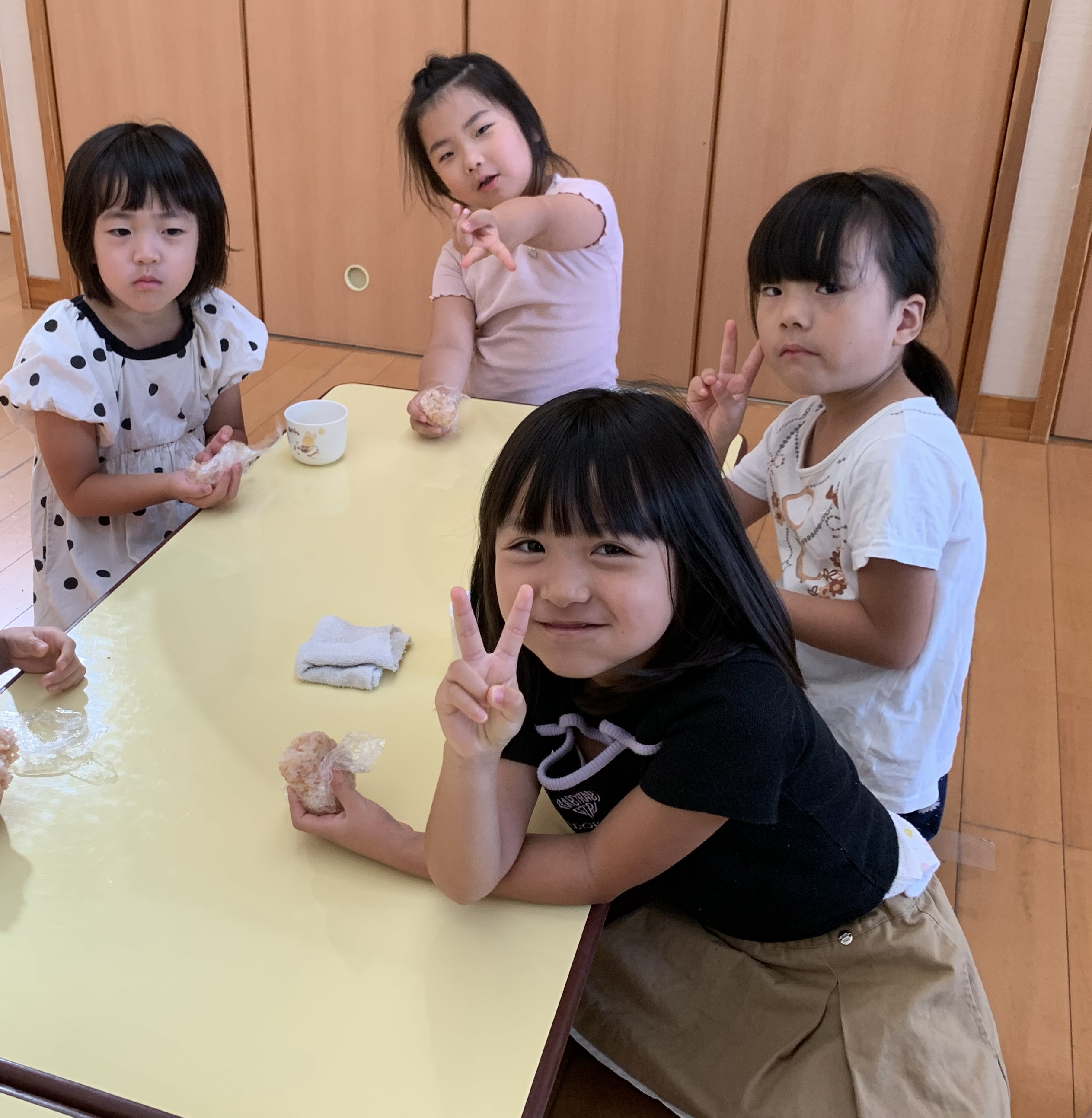 今日は、3時のおやつでひまわり組が籾から籾摺りをし玄米にしたものと、いただいた新米を一緒に炊き、おにぎり作りをしました。 どんなおにぎりが出来たかな~? |