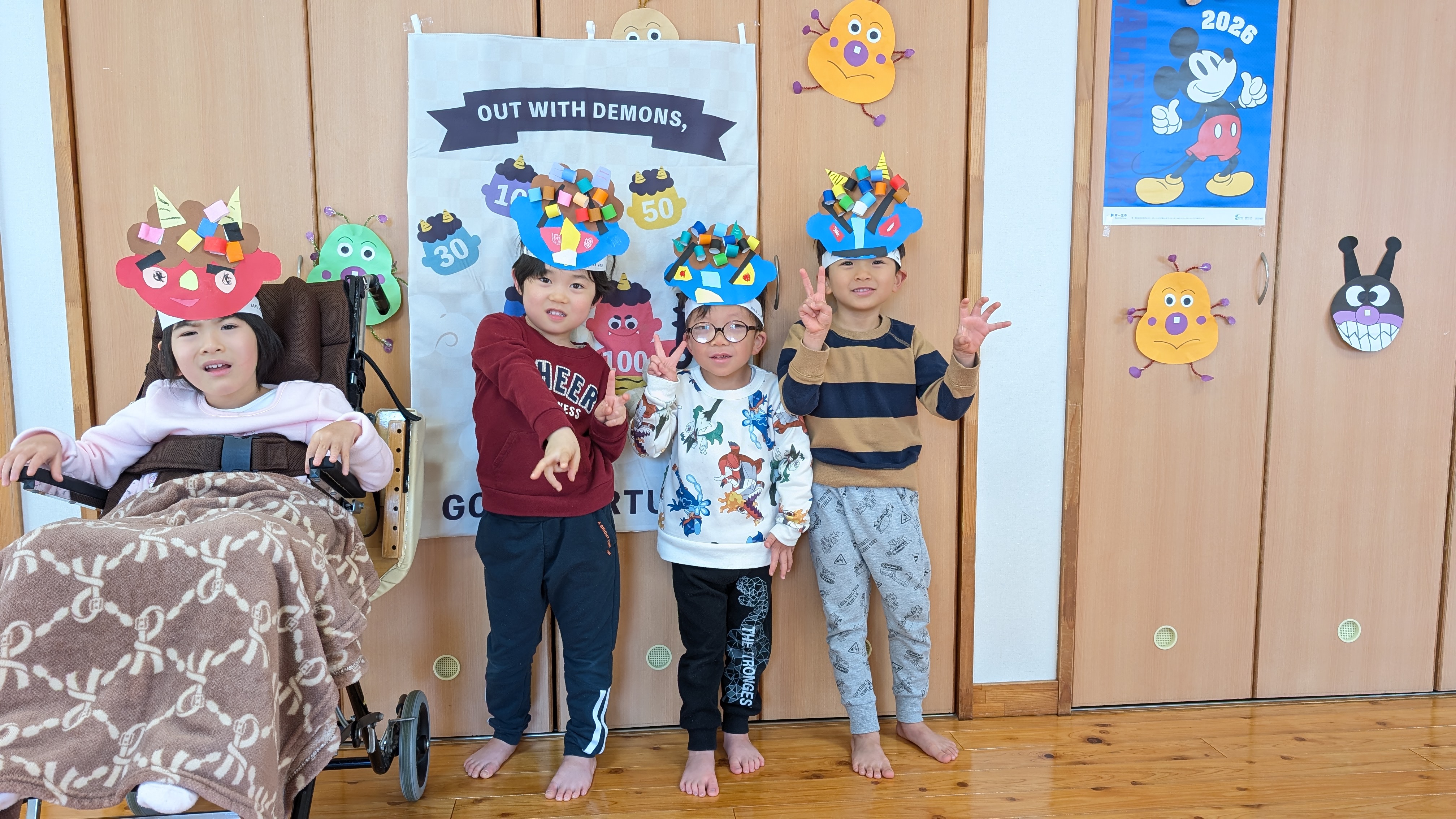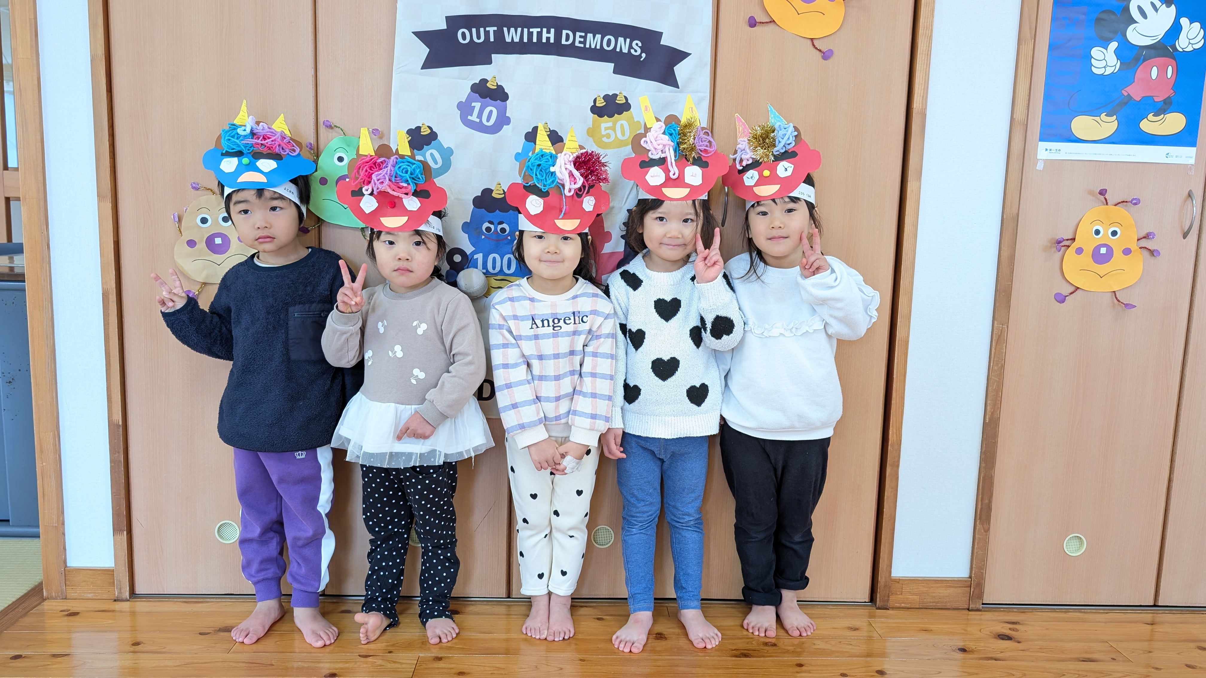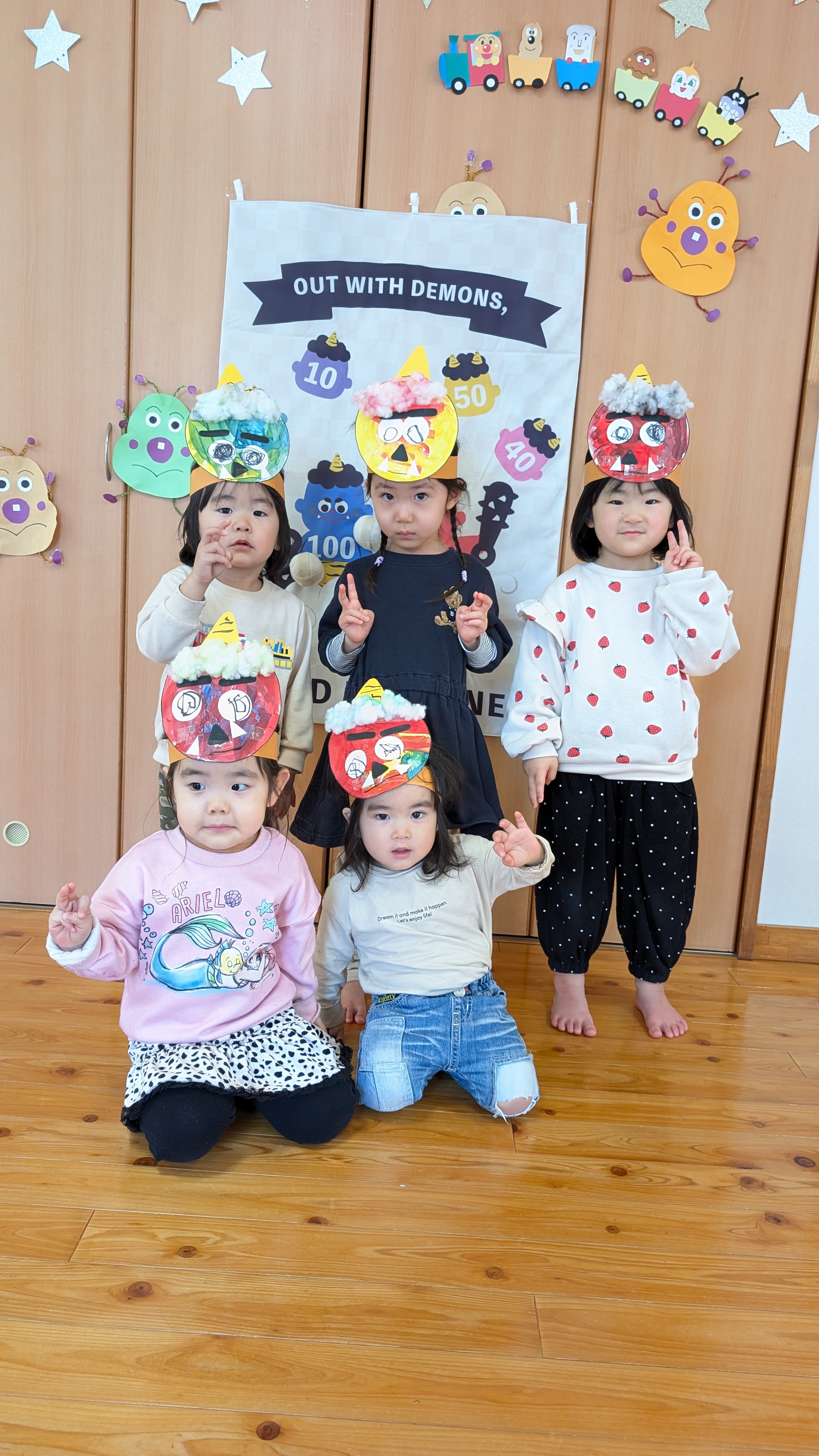 | 2月3日(火)園児たちは、自分で作った鬼の面を被り様々な災いを追い払う豆まきをしました。保育園中が「わー」「キャ~」「え~ん」と大騒ぎ。これなら「泣き虫鬼」も「怒りんぼ鬼」も追い払えたことでしょう。 写真の鬼の面にご注目ください。園児たちが各自で工夫を凝らして表現しています。『お目目パッチリ鬼』『牙にむし歯あり鬼』『怒っている鬼』『可愛い鬼』『角が四角い鬼』等、上手に完成しています。 こんな大作は、捨てられなくて困りますね。そんな時は、写真に残しておくといいそうです。しかし、かく言う私は、なかなか処分するまでに数か月から数年かかりますが… | ||
