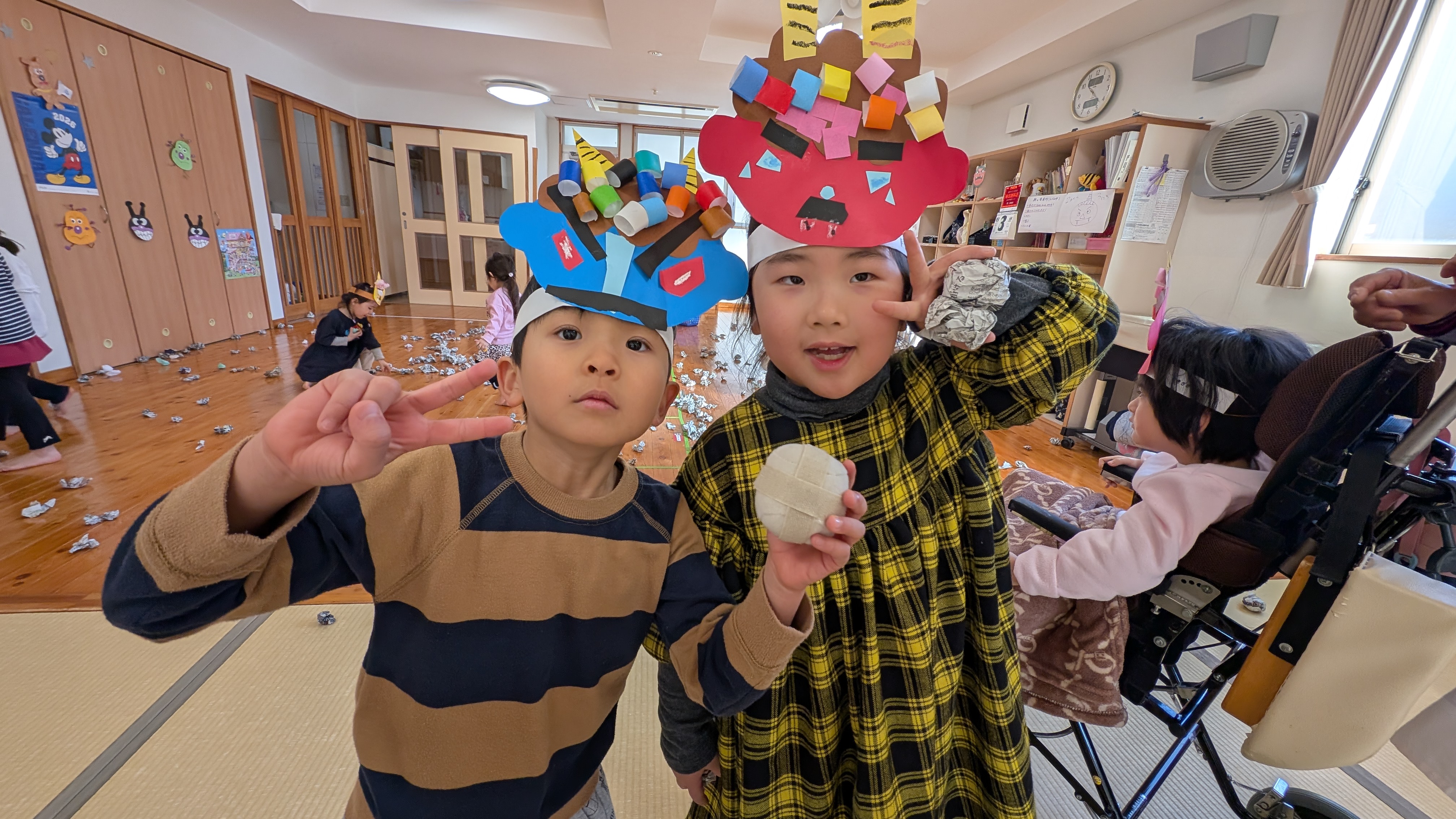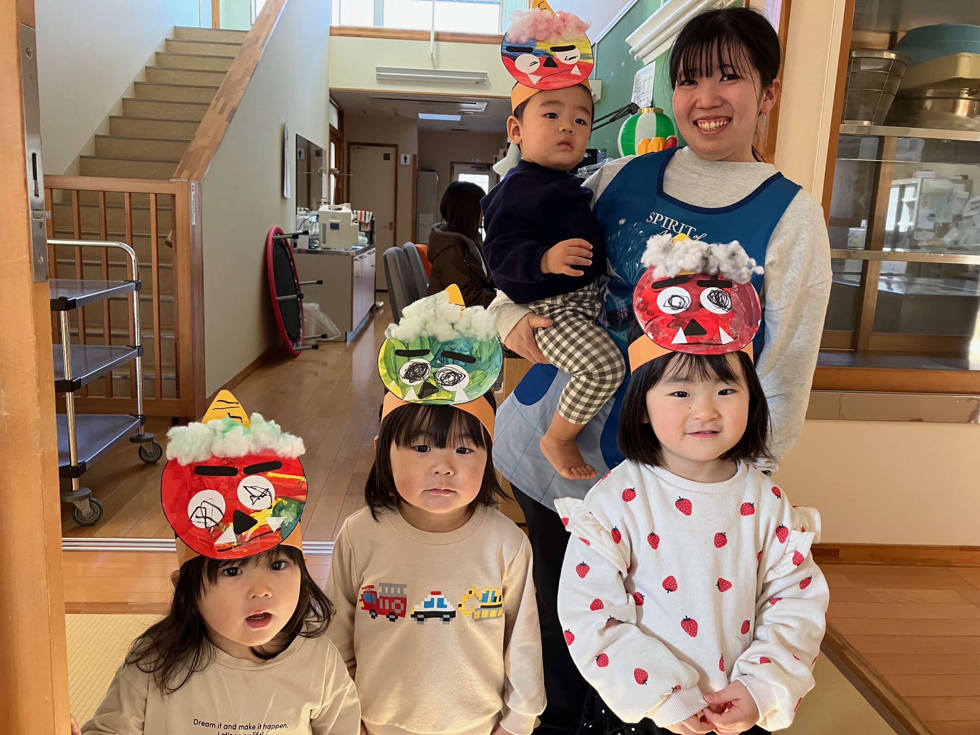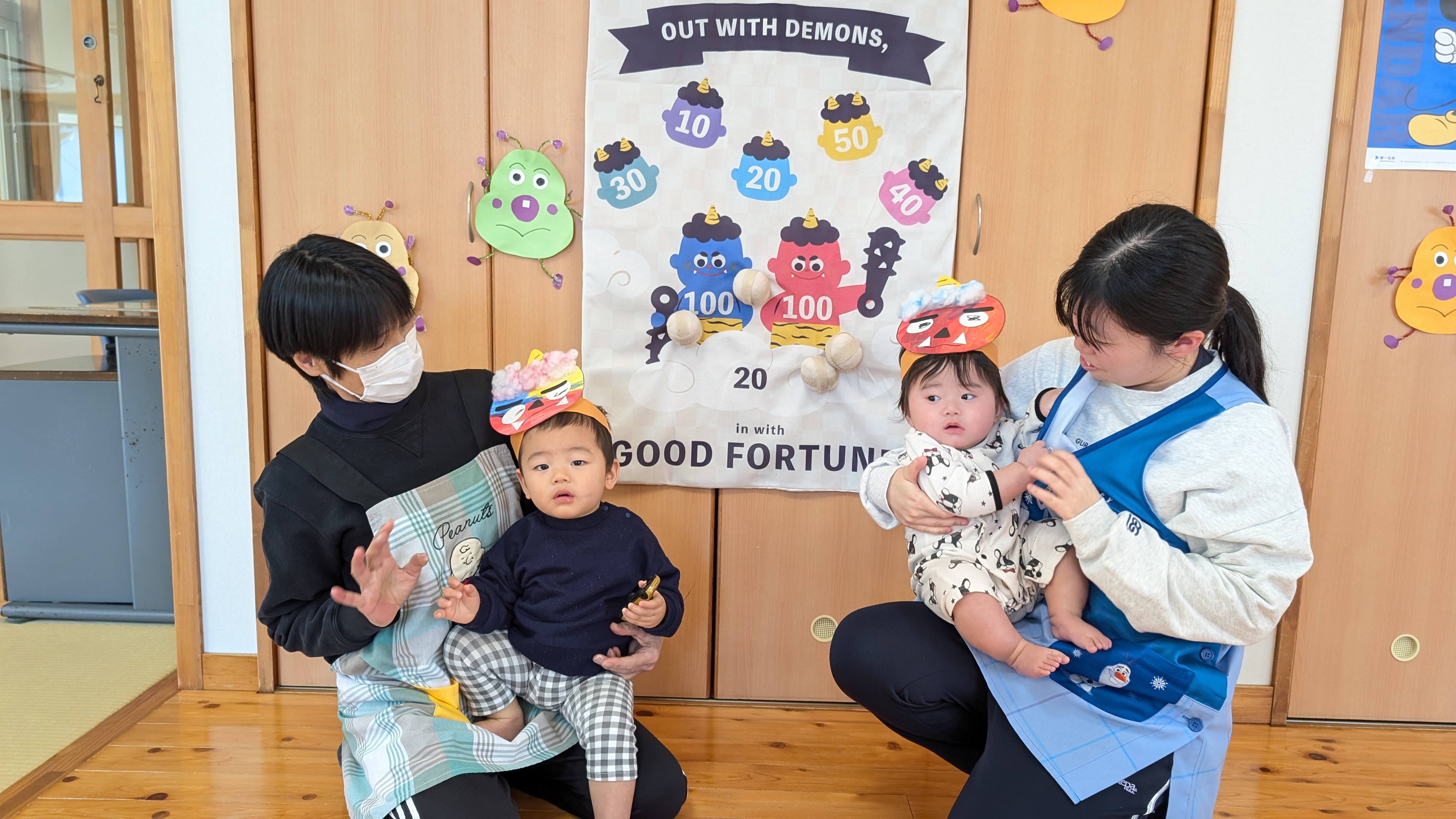 | 2月3日(火)園児たちは、自分で作った鬼の面を被り様々な災いを追い払う豆まきをしました。保育園中が「わー」「キャ~」「え~ん」と大騒ぎ。これなら「泣き虫鬼」も「怒りんぼ鬼」も追い払えたことでしょう。 写真の鬼の面にご注目ください。園児たちが各自で工夫を凝らして表現しています。『お目目パッチリ鬼』『牙にむし歯あり鬼』『怒っている鬼』『可愛い鬼』『角が四角い鬼』等、上手に完成しています。 こんな大作は、捨てられなくて困りますね。そんな時は、写真に残しておくといいそうです。しかし、かく言う私は、なかなか処分するまでに数か月から数年かかりますが… | ||