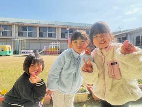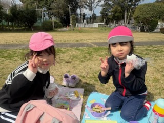 | 3月10日(火)今日は、園児も職員も空のお弁当箱を持参して登園です。何故ならば・・・お別れ遠足だからです。 現在(午前8:50)、ひまわり組さんたちは、各自でおにぎりを握り上げ、これから遠足の準備をして出発します。 |
