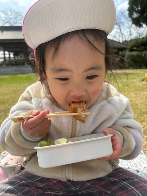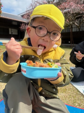 | 買い物の後は、保育園まで戻り東向寺の境内で楽しみにしていたお弁当タイム。お弁当を食べるというだけで徒歩の疲れも吹き飛んだ子ども達でした。 | ||