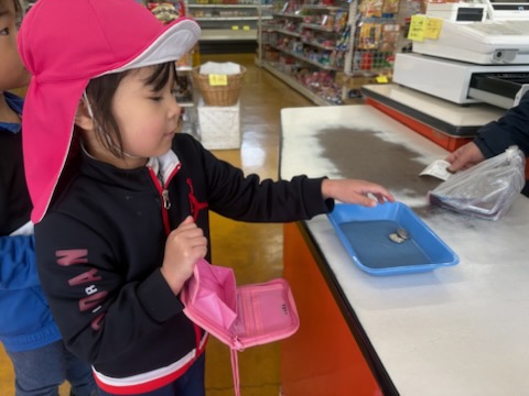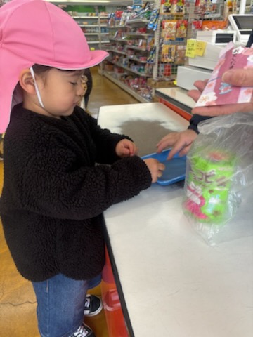 | 今年度のお別れ遠足のミッションは、『算数って何だろう』で学んだお金の数え方を生かし買物をすることです。各自のお財布に4・5歳児さんは300円、3歳児さんは200円を入れて臨みました。 机上では、上手に買い物ができる子ども達ですが、実際になるとお財布から小銭を出すだけでも難しい…貴重な体験ができました。無事に買い物を終え帰路に。往復3km、途中ダラダラとした坂道も頑張って歩きました。 |