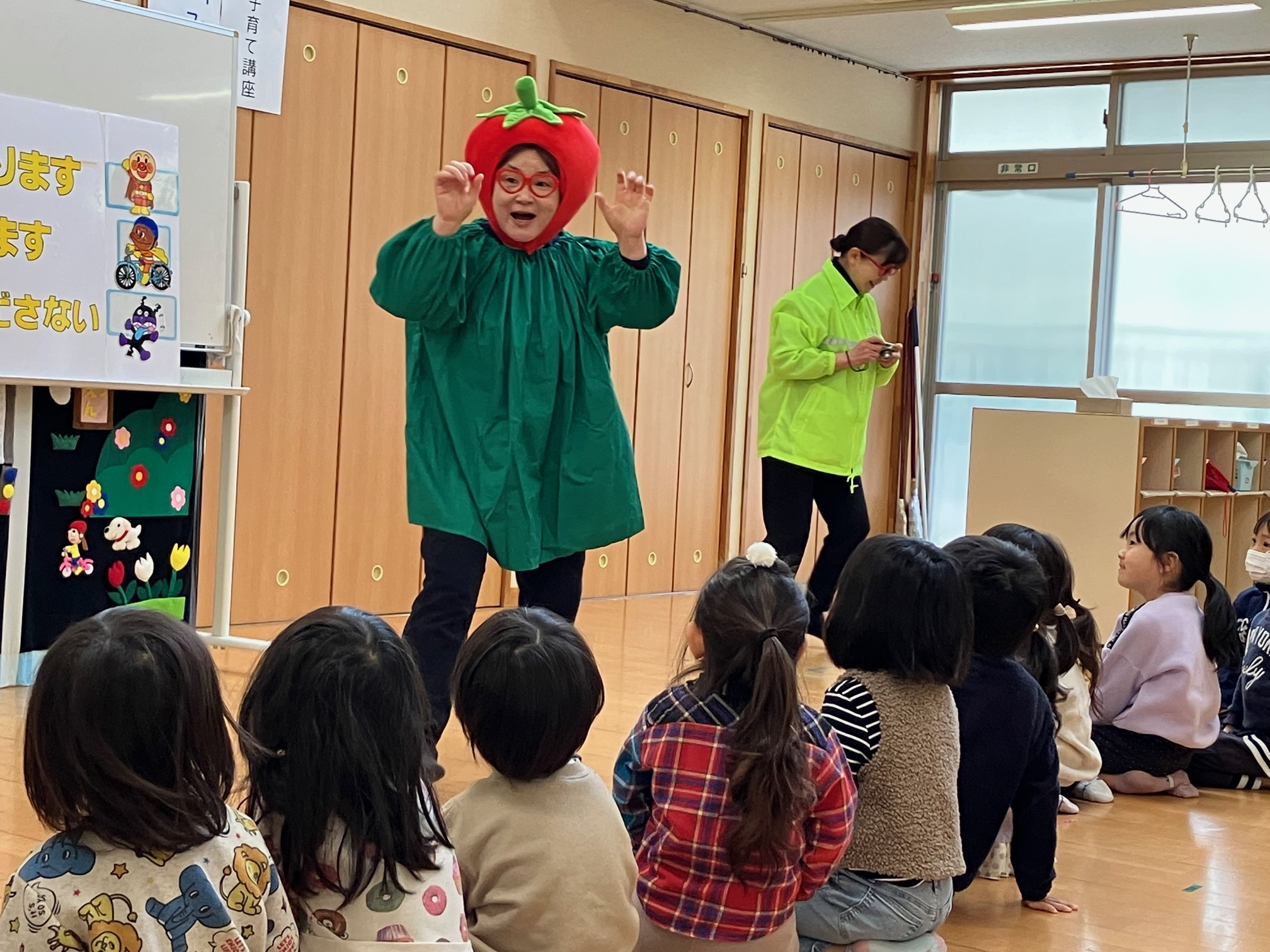 メニュ―は『おにぎり(わかめ・ゆかり)、鶏の唐揚げ、魚肉ソーセージのソテー、ブロッコリーと人参のサラダ、バナナ』です。 子ども達は、お寺の境内で食べる予定です。 |