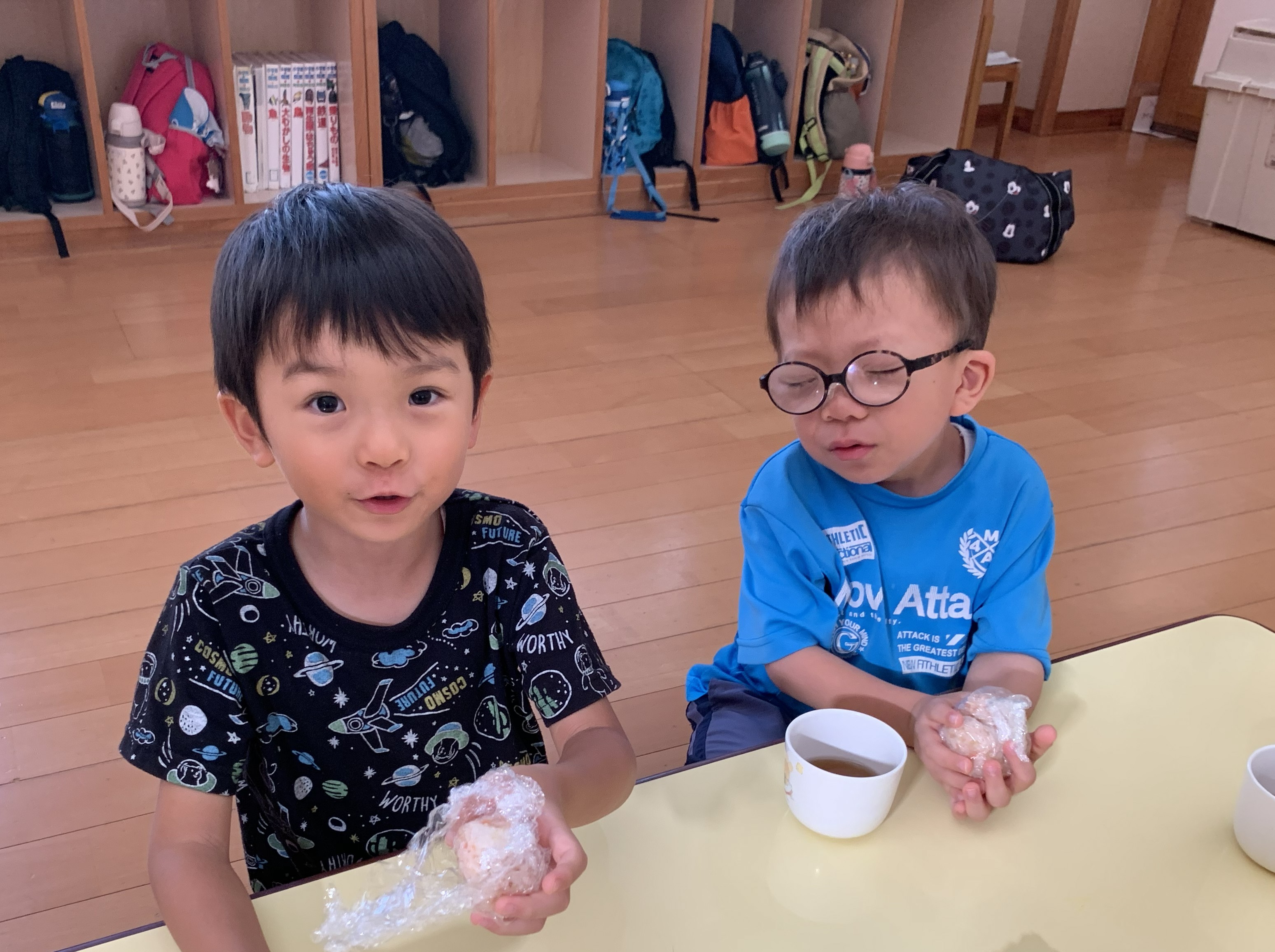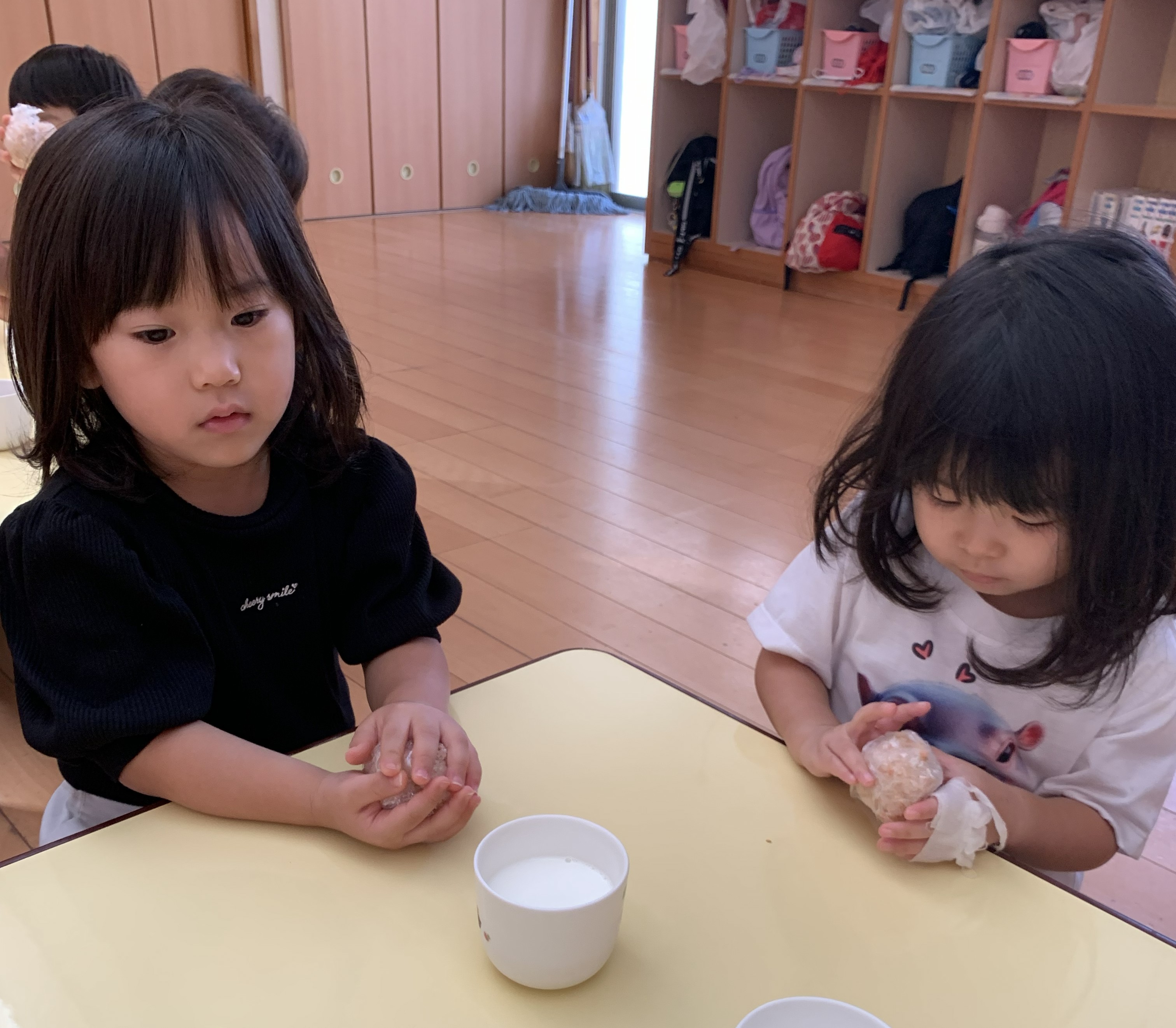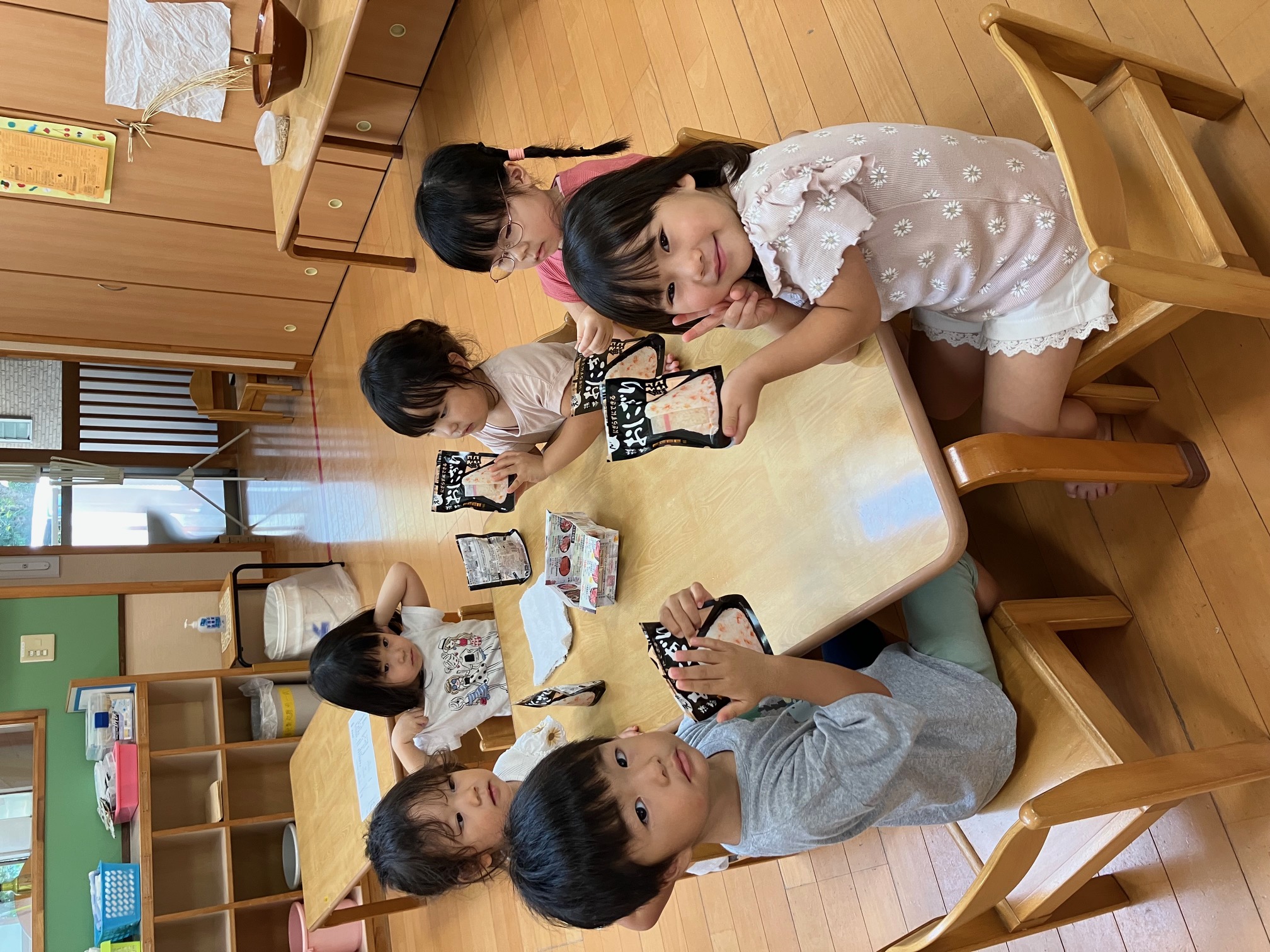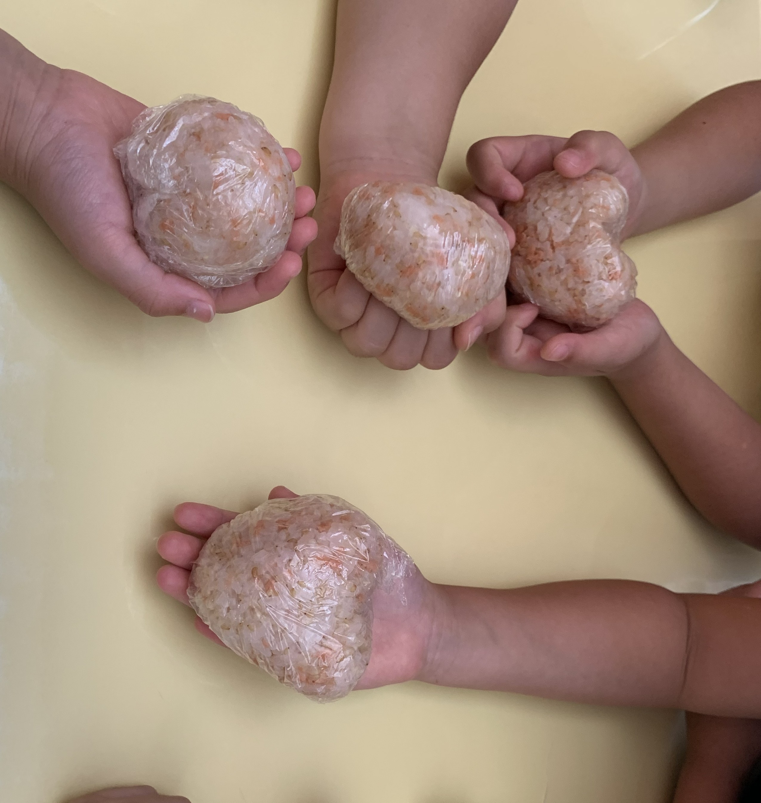 今日は、3時のおやつでひまわり組が籾から籾摺りをし玄米にしたものと、いただいた新米を一緒に炊き、おにぎり作りをしました。 どんなおにぎりが出来たかな~? |