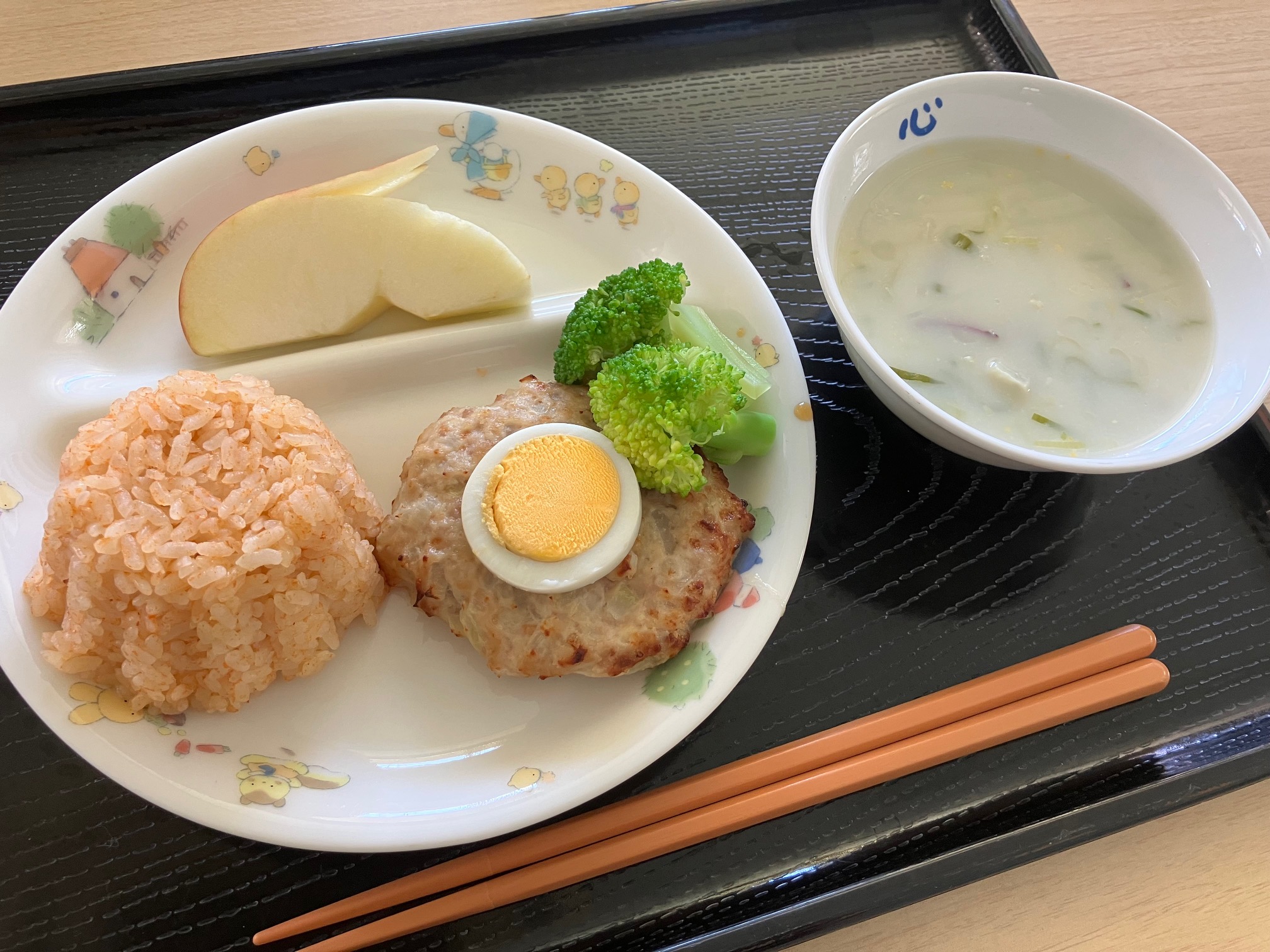 6月の誕生会給食は、かたつむりハンバーグ。子ども達は「やったー!!」「かわいい~」「ツノがある。」「メロンも大好き!」と喜びを言葉で表現していました。 ツノ(正しくは触覚)から食べ始める子、ケチャップを箸の先に付けて美味しそうに食べる子etc. 箸練習中の子は、しめじのツノが挟みにくそうでしたが何度か挑戦し上手に食べていました。 |