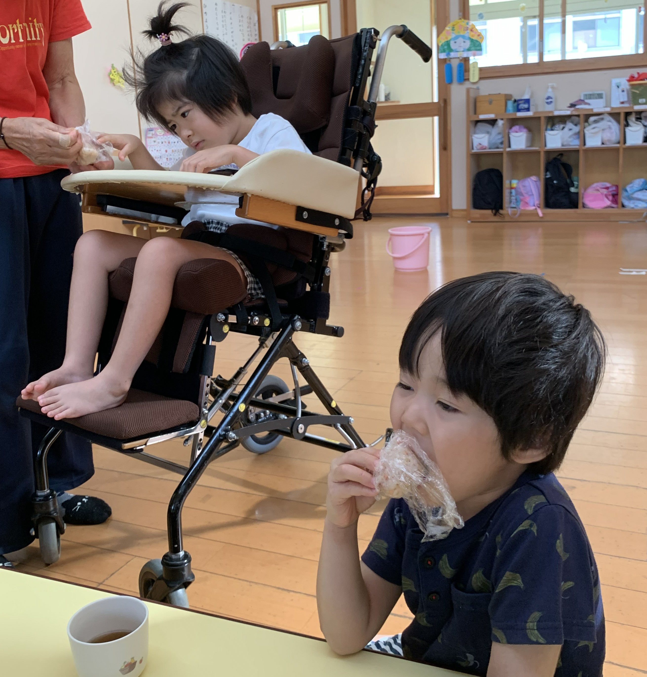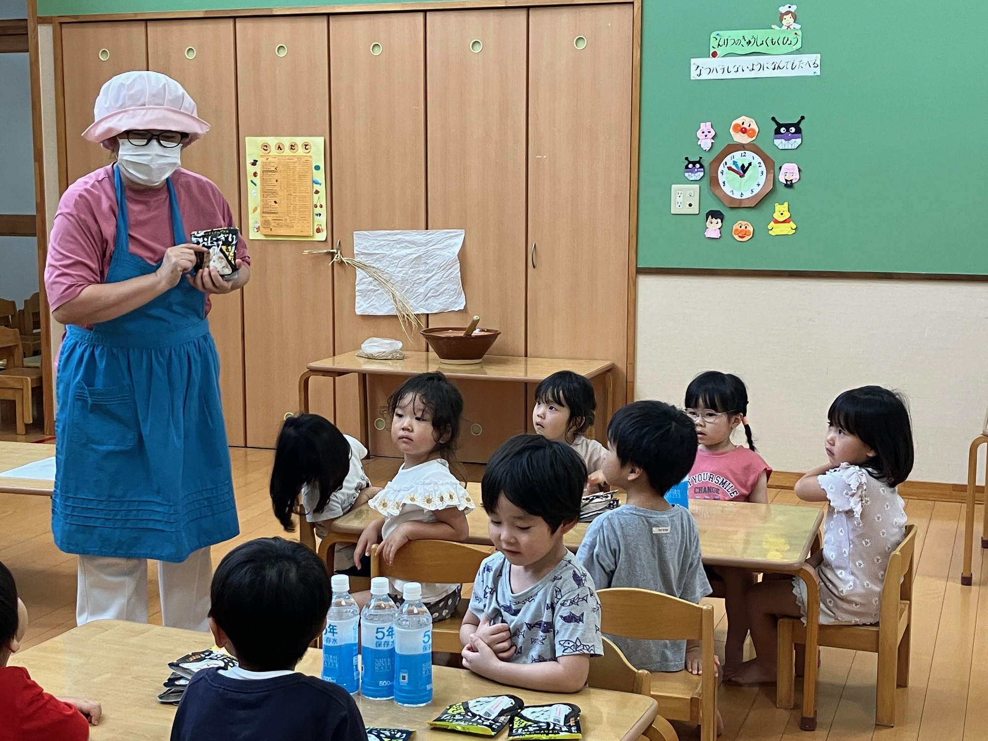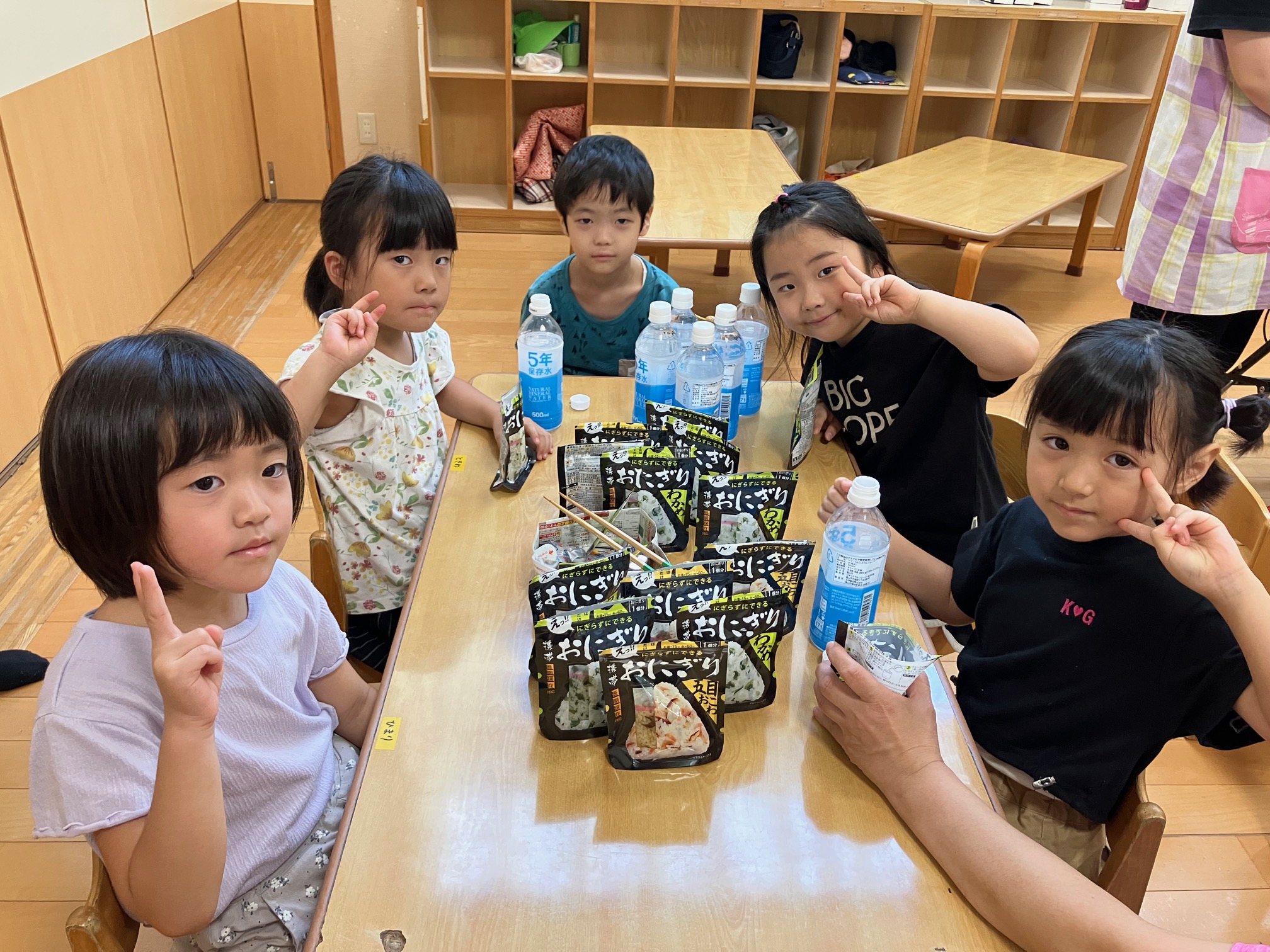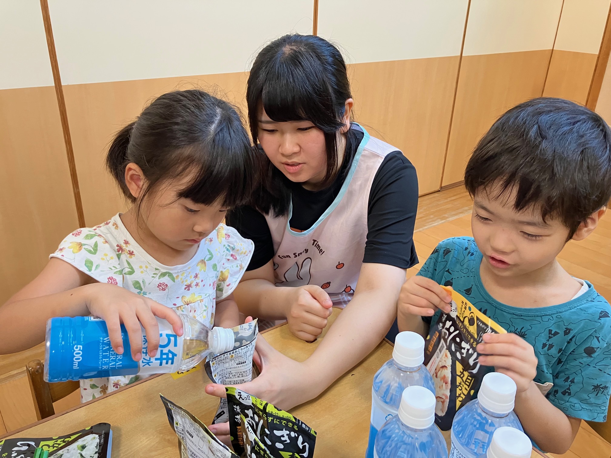 合わせて簡単な災害時の調理方法も体験。今年は、園児たちはα米に水を入れてオニギリを。給食室では、袋に入れて煮るショートパスタのトマト煮を作りました。