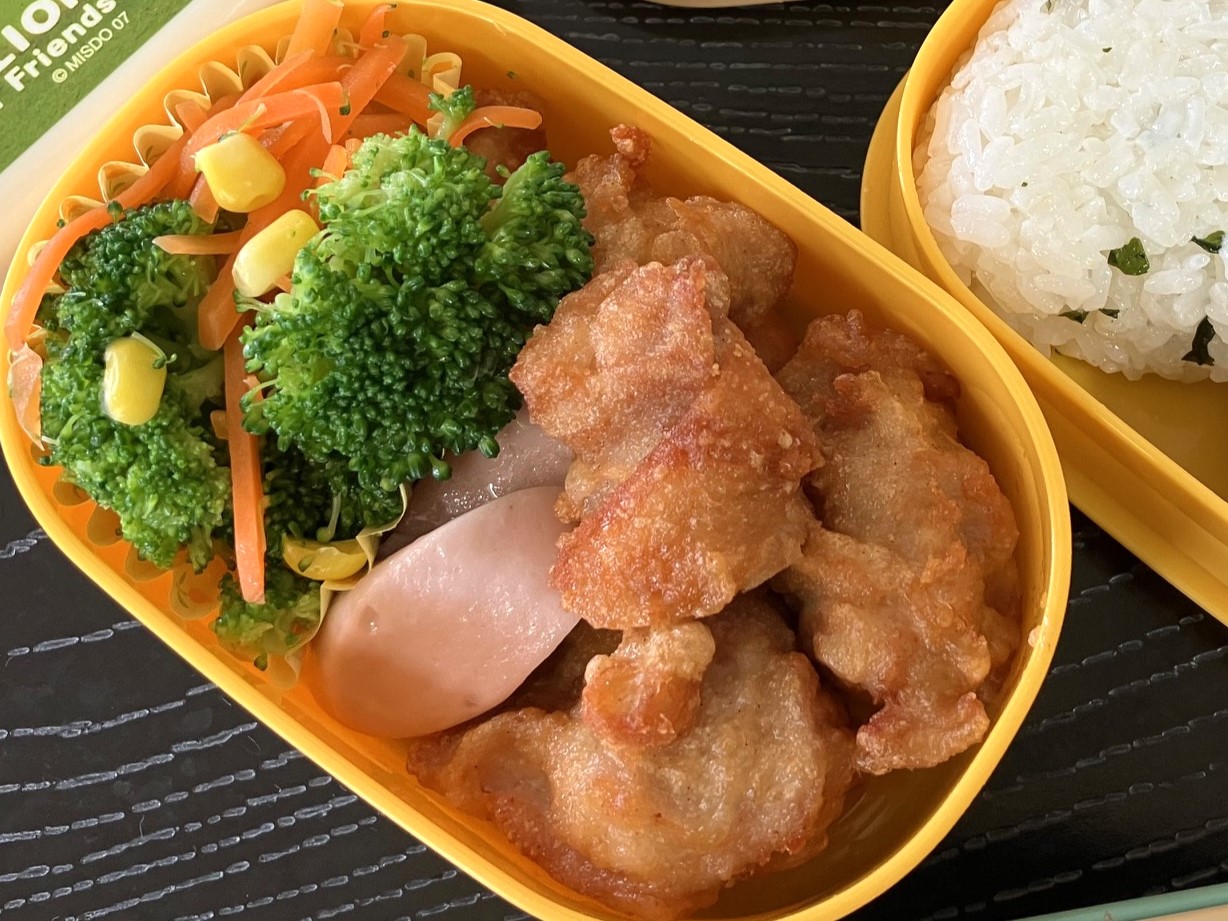メニュ―は『おにぎり(わかめ・ゆかり)、鶏の唐揚げ、魚肉ソーセージのソテー、ブロッコリーと人参のサラダ、バナナ』です。 子ども達は、お寺の境内で食べる予定です。 |