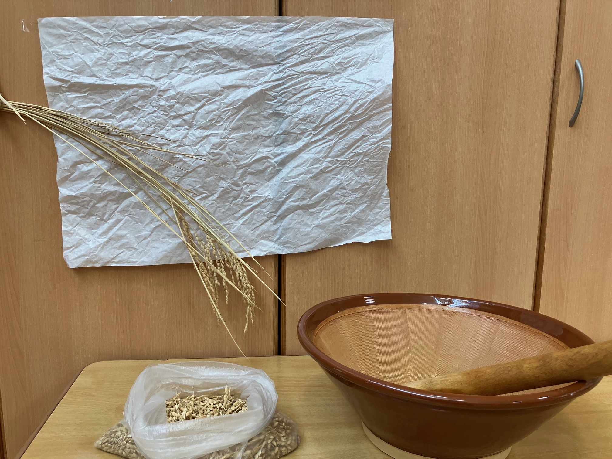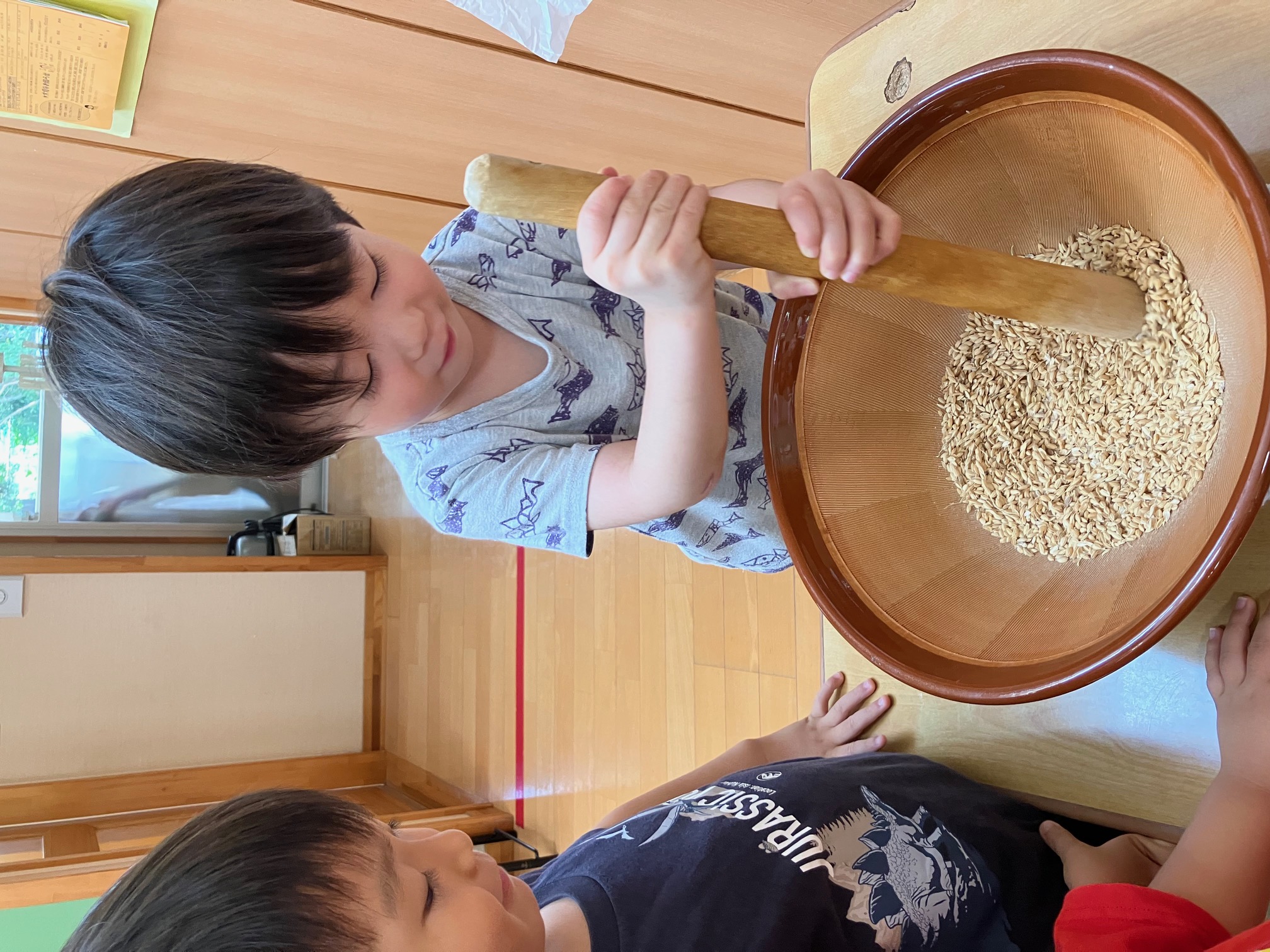 ひまわり組では、すり鉢とすりこぎを使い籾を精米し、玄米にしています。3カップ程の籾でも玄米にするためには何百回もする必要があり、少しづつコツコツと精米を続けています。 この玄米で『オニギリを作る!』目標を掲げているひまわり組さんです。 |