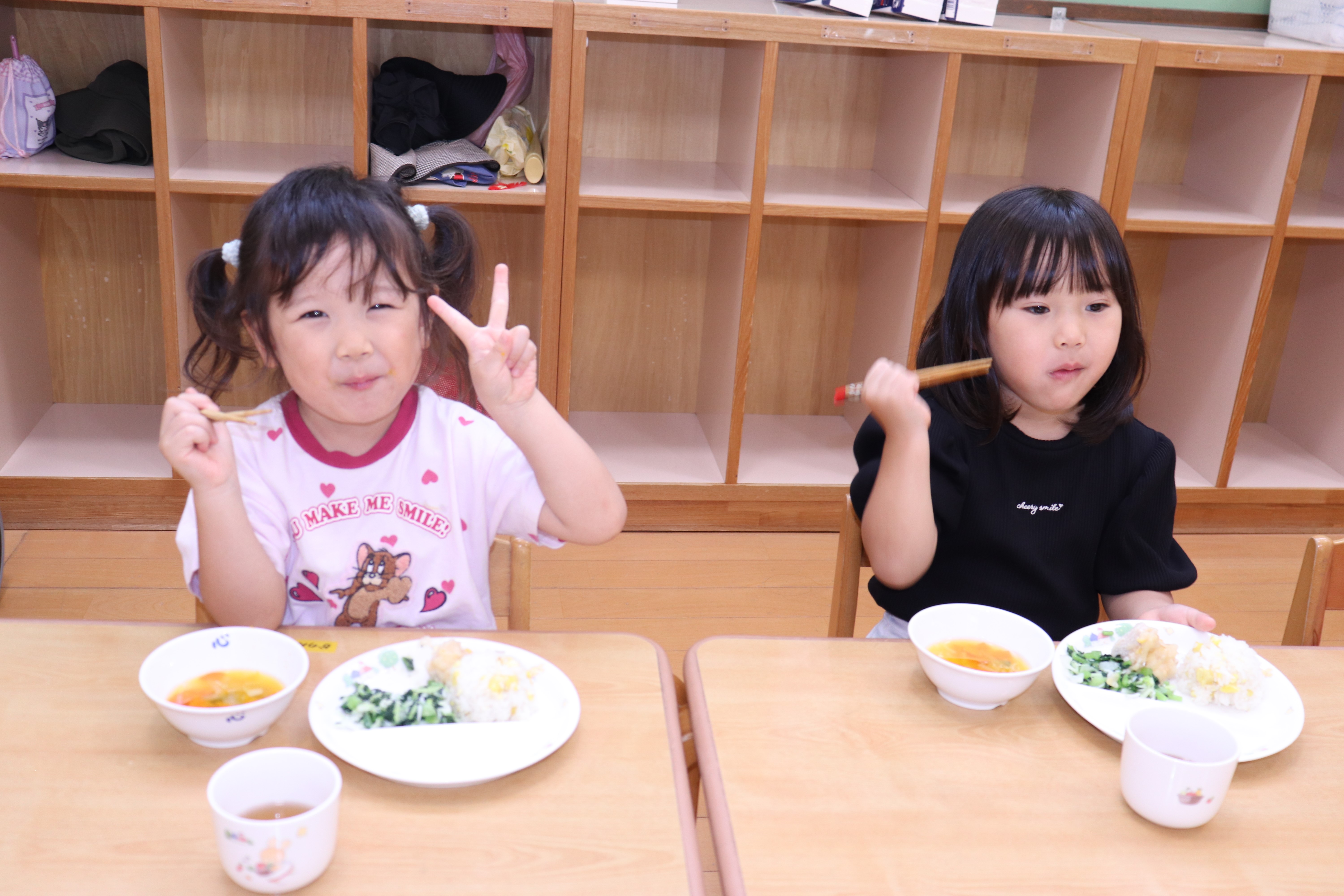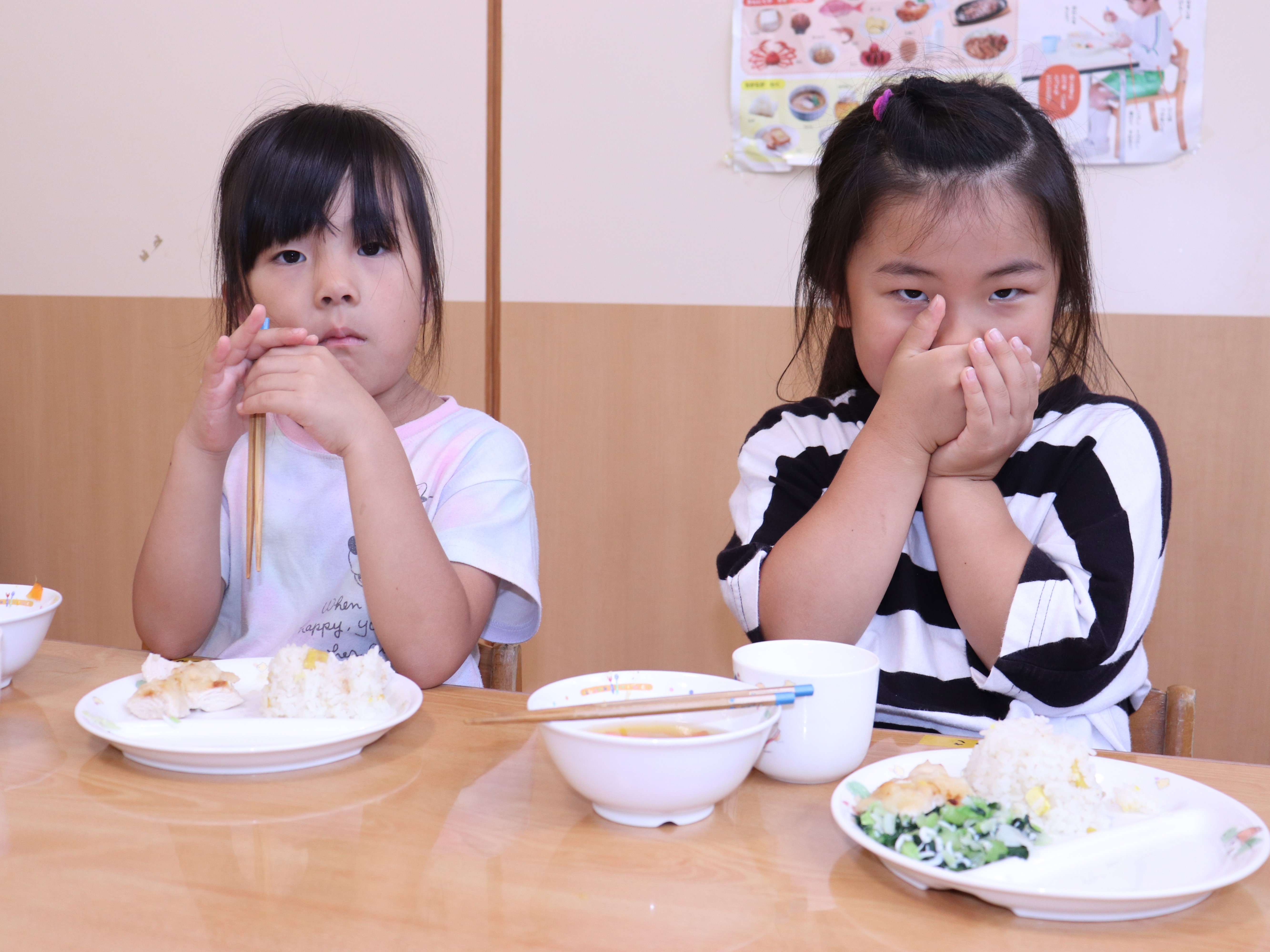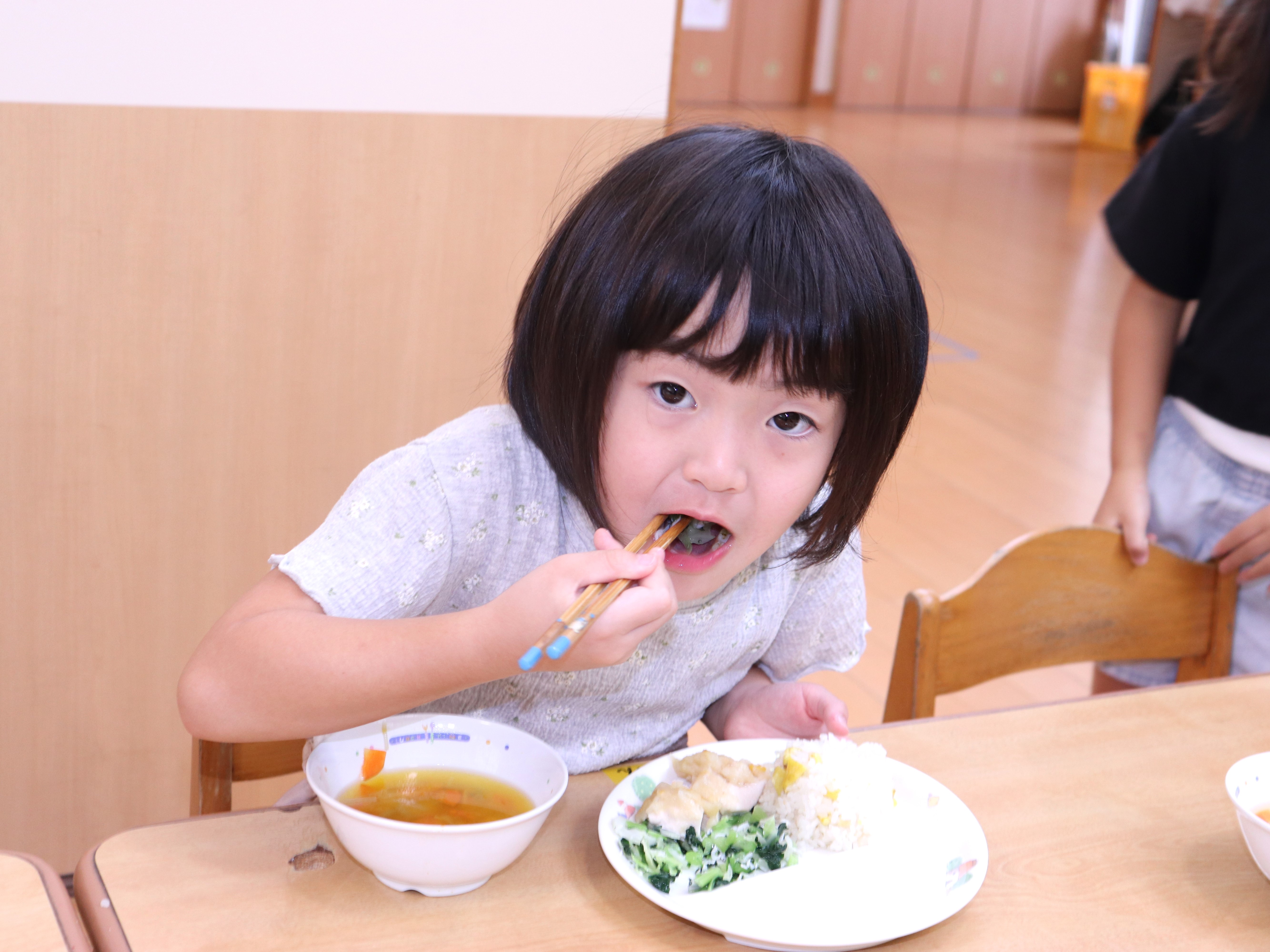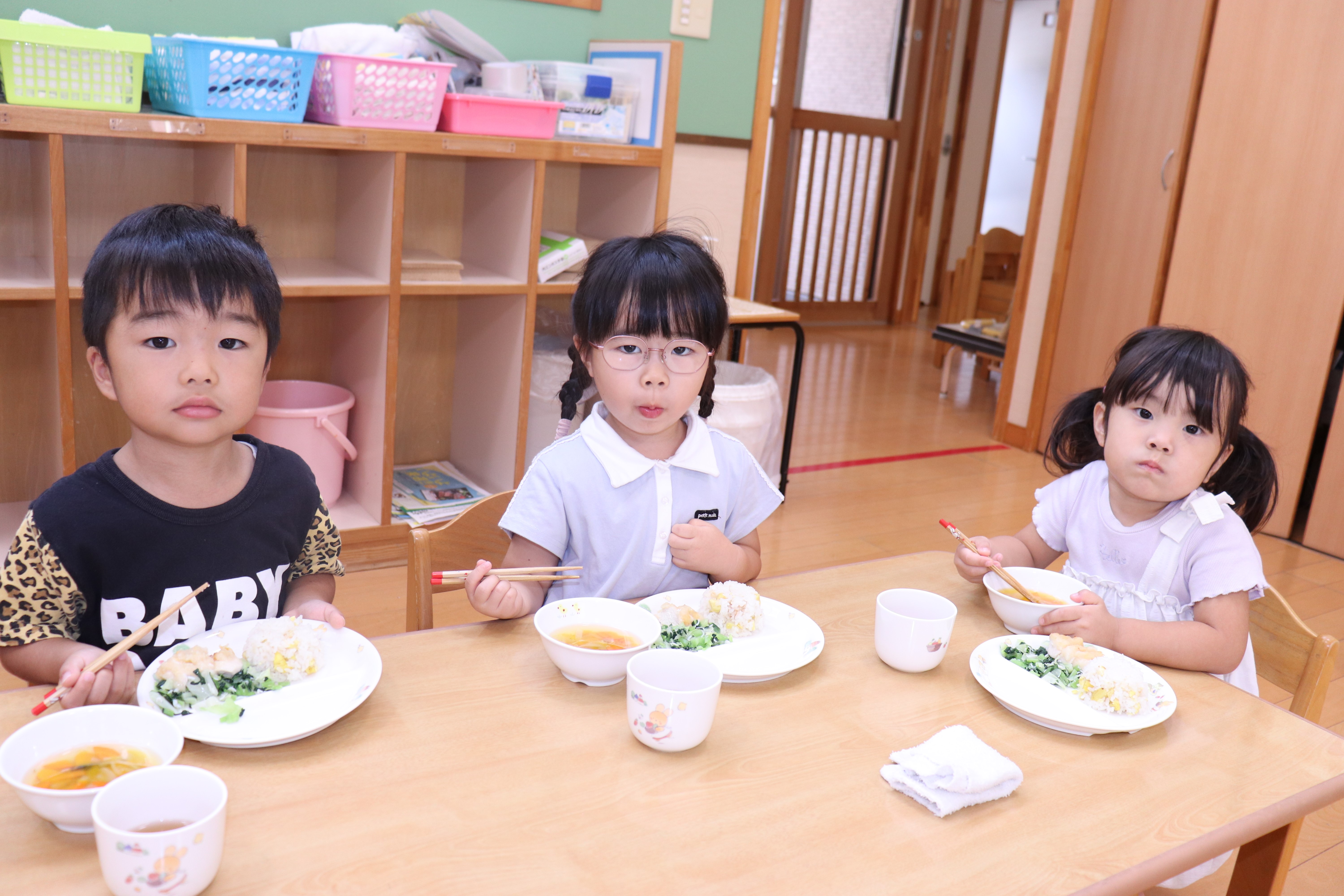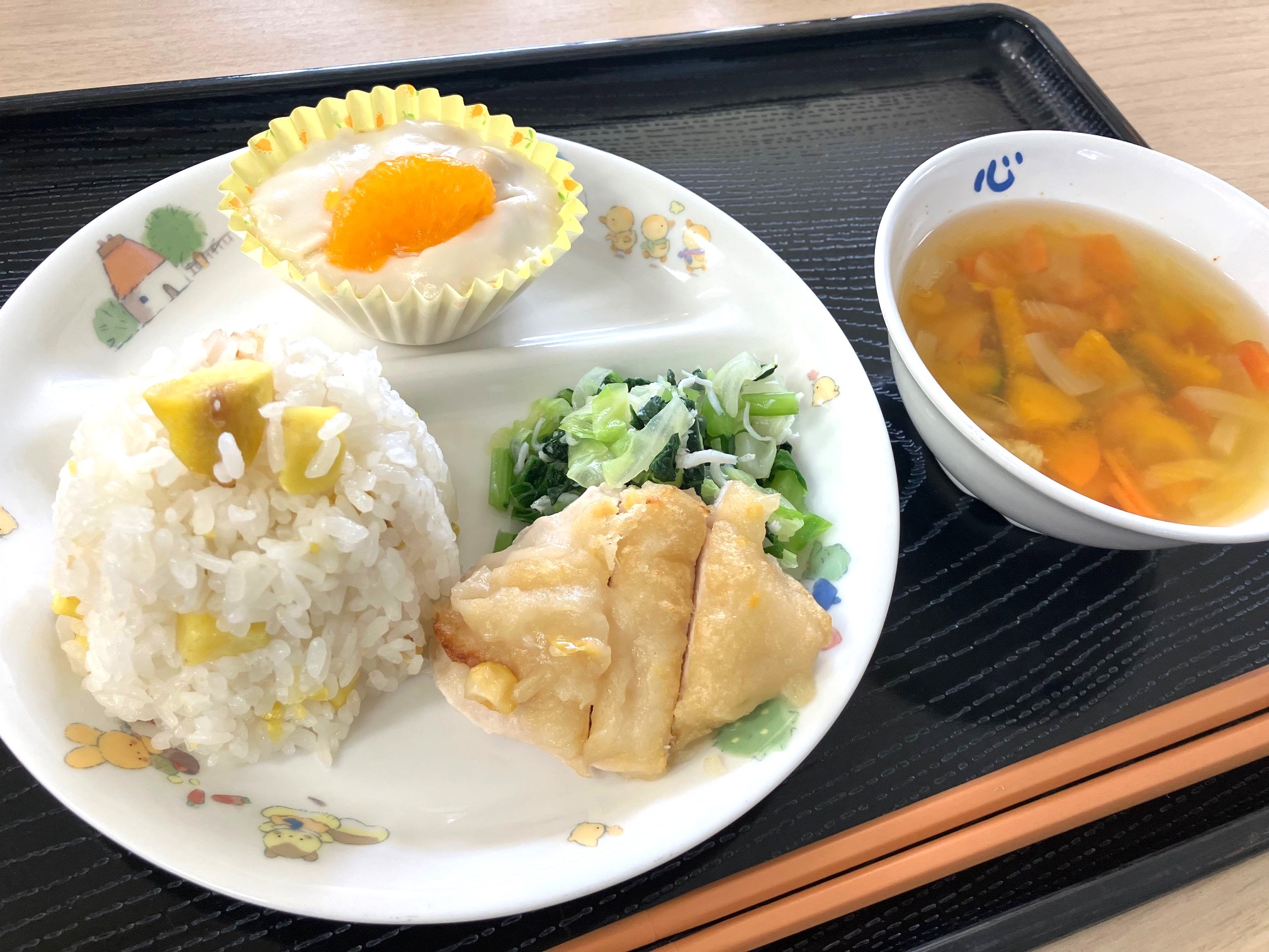 | 10月21日(火) 今日の給食は、10月の誕生会メニューでした。今回のメインは、秋の味覚『栗ごはん♡』。我が家では、栗ごはんは栗の鬼皮を剝くのが大変なため年に一度の御馳走です。それが保育園でも食べられ嬉しかったです。 他は『鶏肉のポテト焼き・小松菜とキャベツのしらす和え・かぼちゃスープ・ブラマンジェ』季節感と栄養バランスの取れた誕生日給食でした。 |