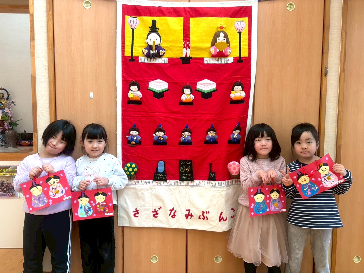 ひな祭りの意味を学習し、今日まで健康に育ってれたことにの感謝し、これからも早寝・早起き・朝ごはんを実行し自分で健康管理をしていくお約束をしました。 更に、ひな人形を一人ひとり確認しながら慣れべました。三人官女や五人囃子な配列は、毎年飾っていても難しいですね。 子ども達が、ひな人形の制作をしました。それぞれ表情豊かな可愛らしいひな人形が完成。是非、お家に飾つてください。 ※ ブログに入力できない写真があり、園児写真を全員分載せることができませんでした。申し訳ございません。当ホームページの写真販売には当日出席者の写真を掲載しています。そちらをご覧ください。 |