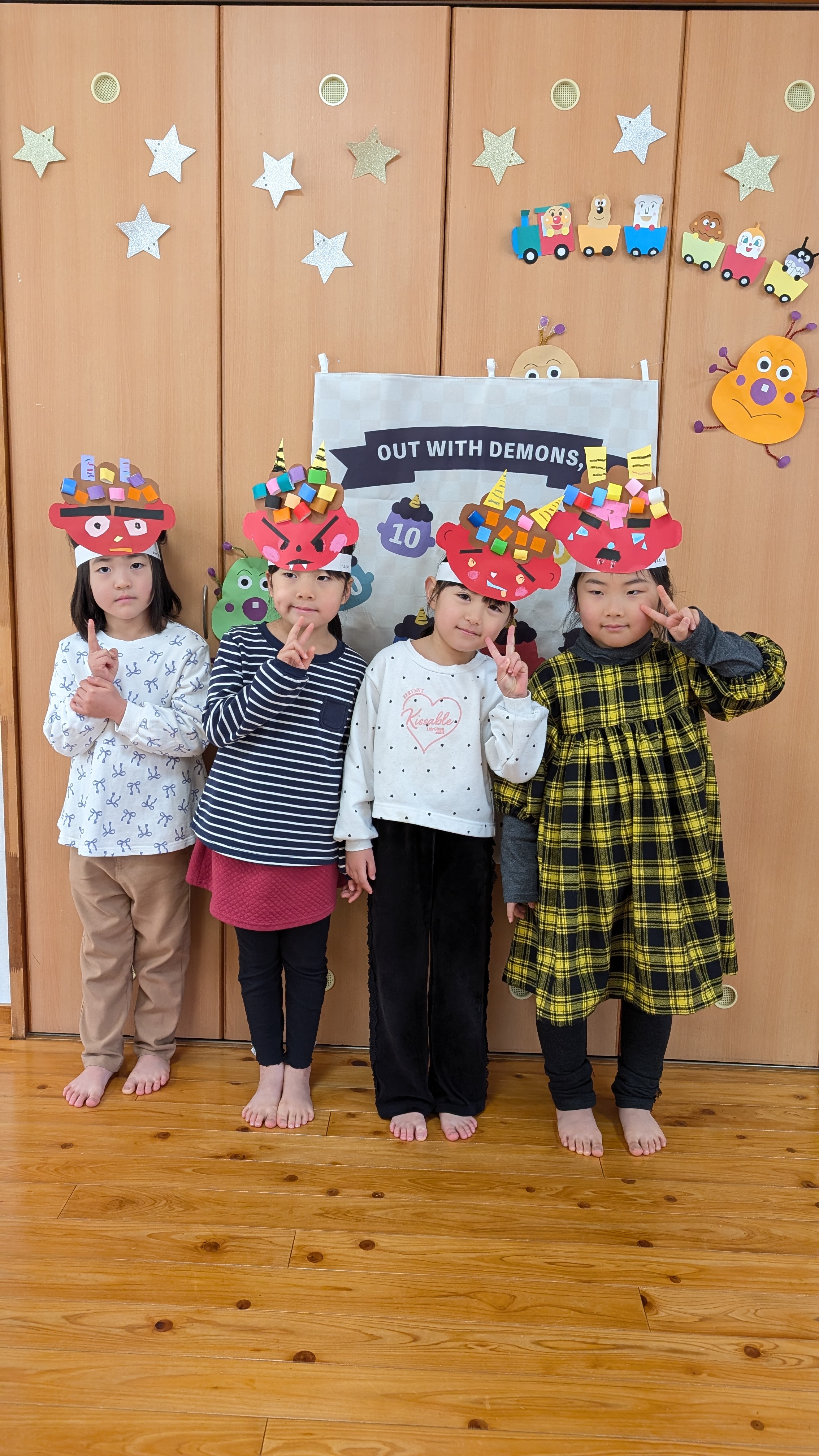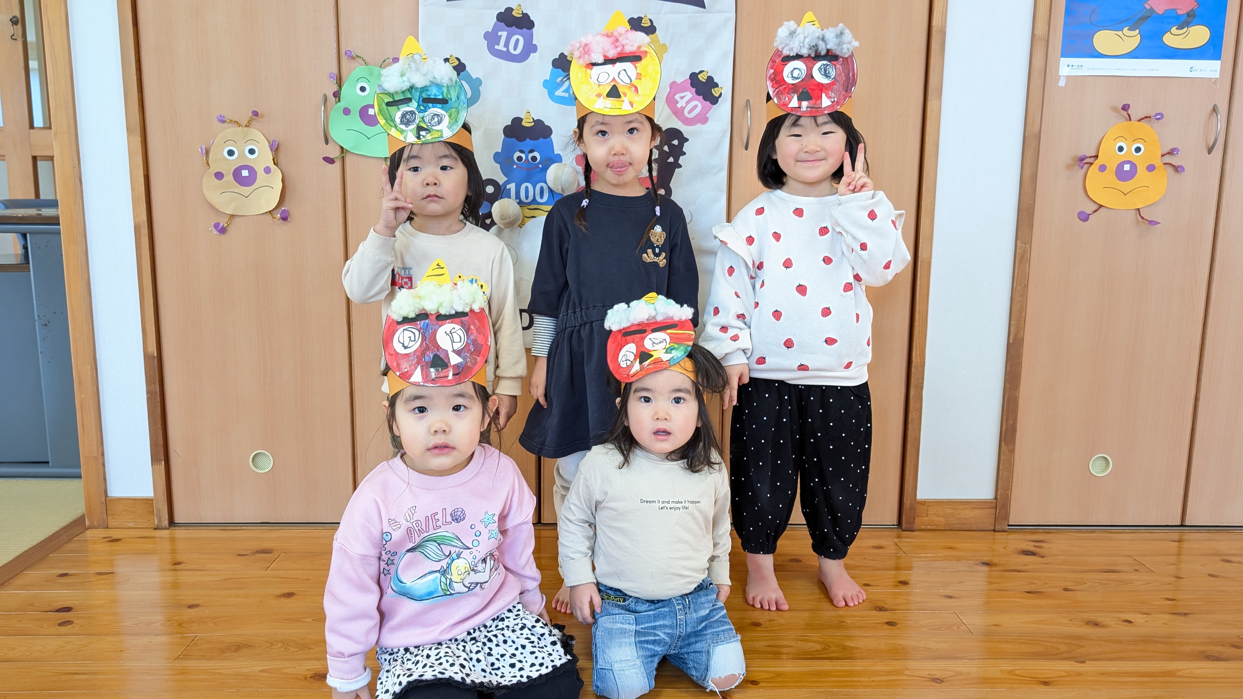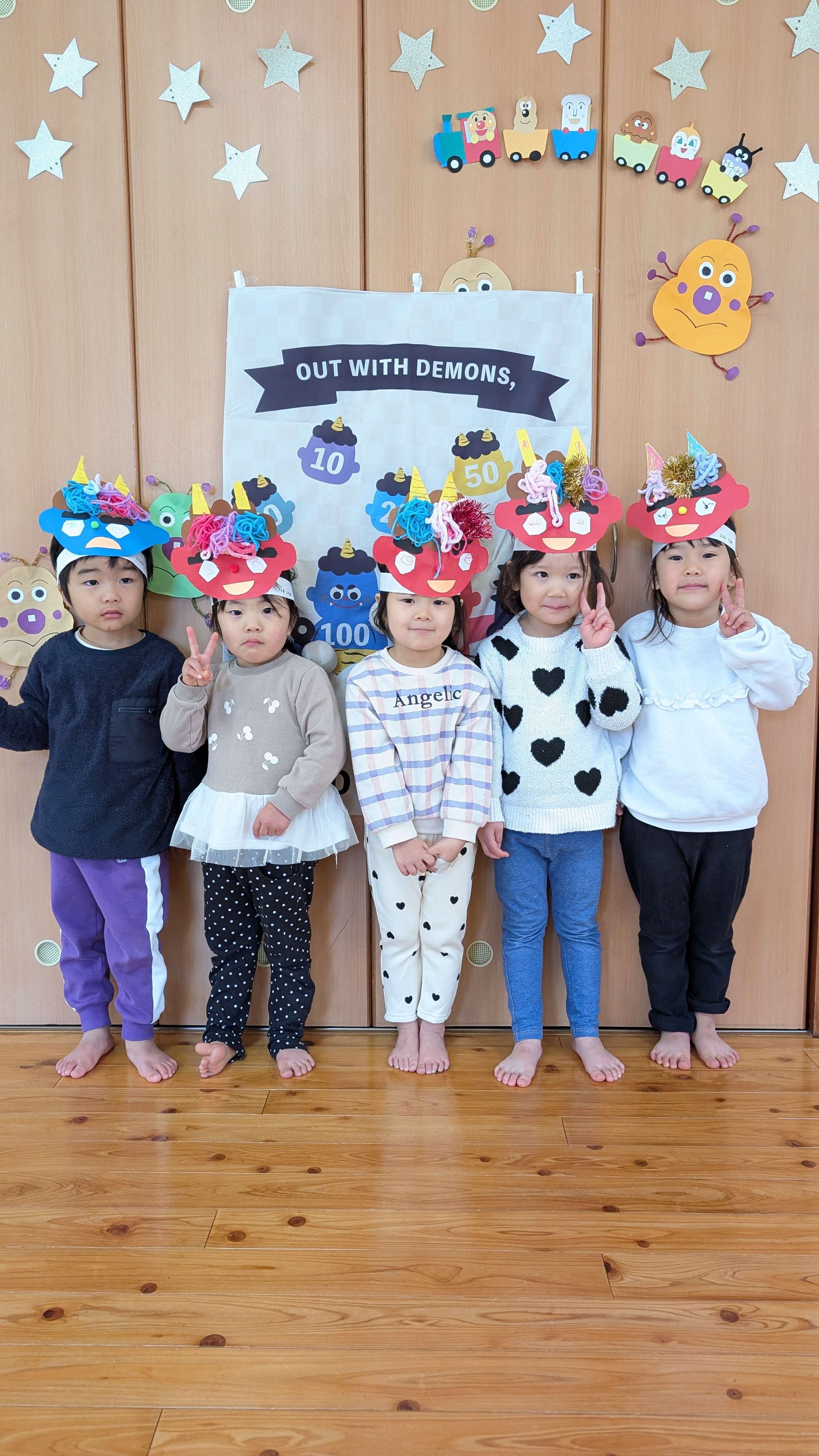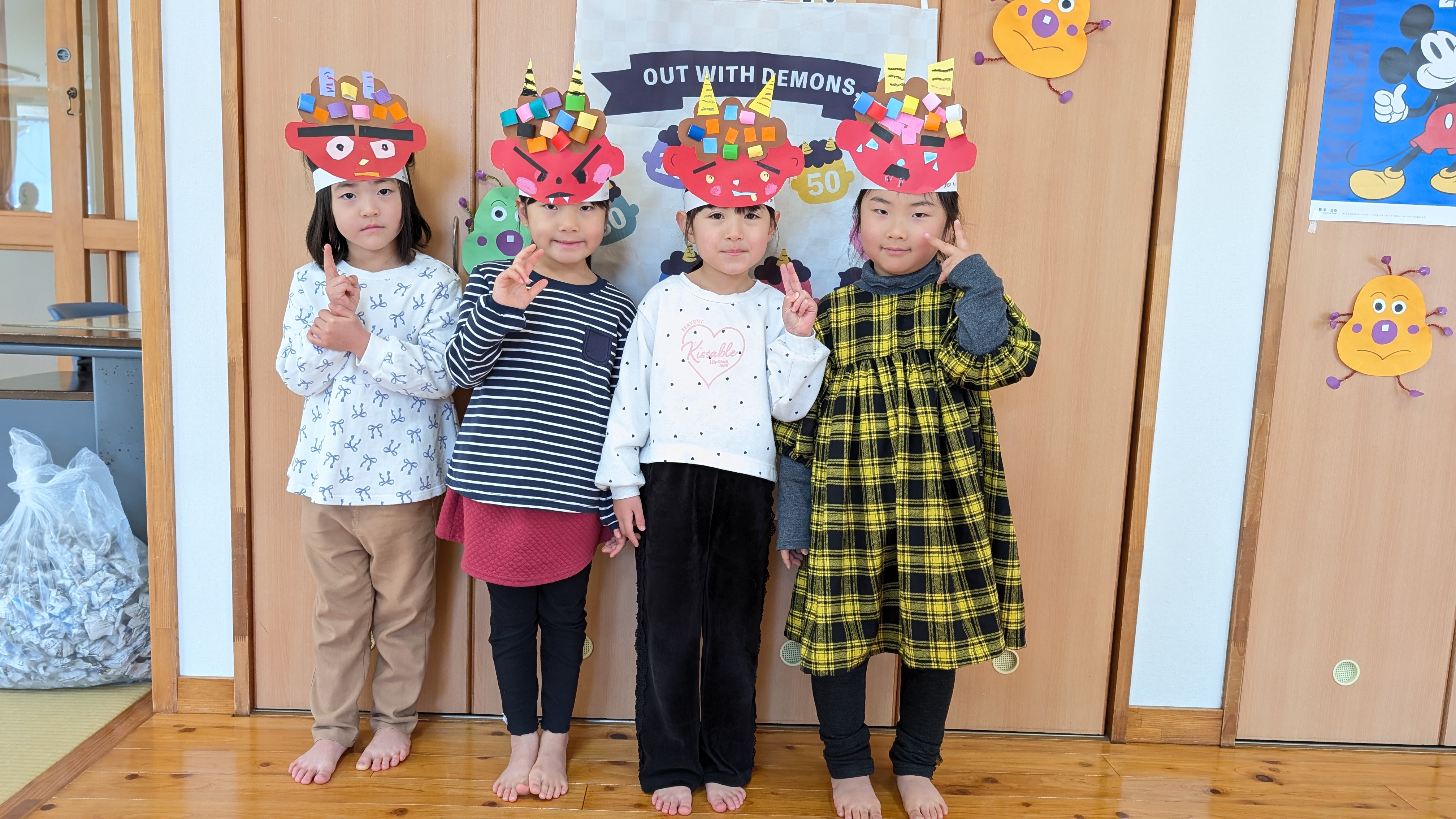 | 2月3日(火)園児たちは、自分で作った鬼の面を被り様々な災いを追い払う豆まきをしました。保育園中が「わー」「キャ~」「え~ん」と大騒ぎ。これなら「泣き虫鬼」も「怒りんぼ鬼」も追い払えたことでしょう。 写真の鬼の面にご注目ください。園児たちが各自で工夫を凝らして表現しています。『お目目パッチリ鬼』『牙にむし歯あり鬼』『怒っている鬼』『可愛い鬼』『角が四角い鬼』等、上手に完成しています。 こんな大作は、捨てられなくて困りますね。そんな時は、写真に残しておくといいそうです。しかし、かく言う私は、なかなか処分するまでに数か月から数年かかりますが… | ||
