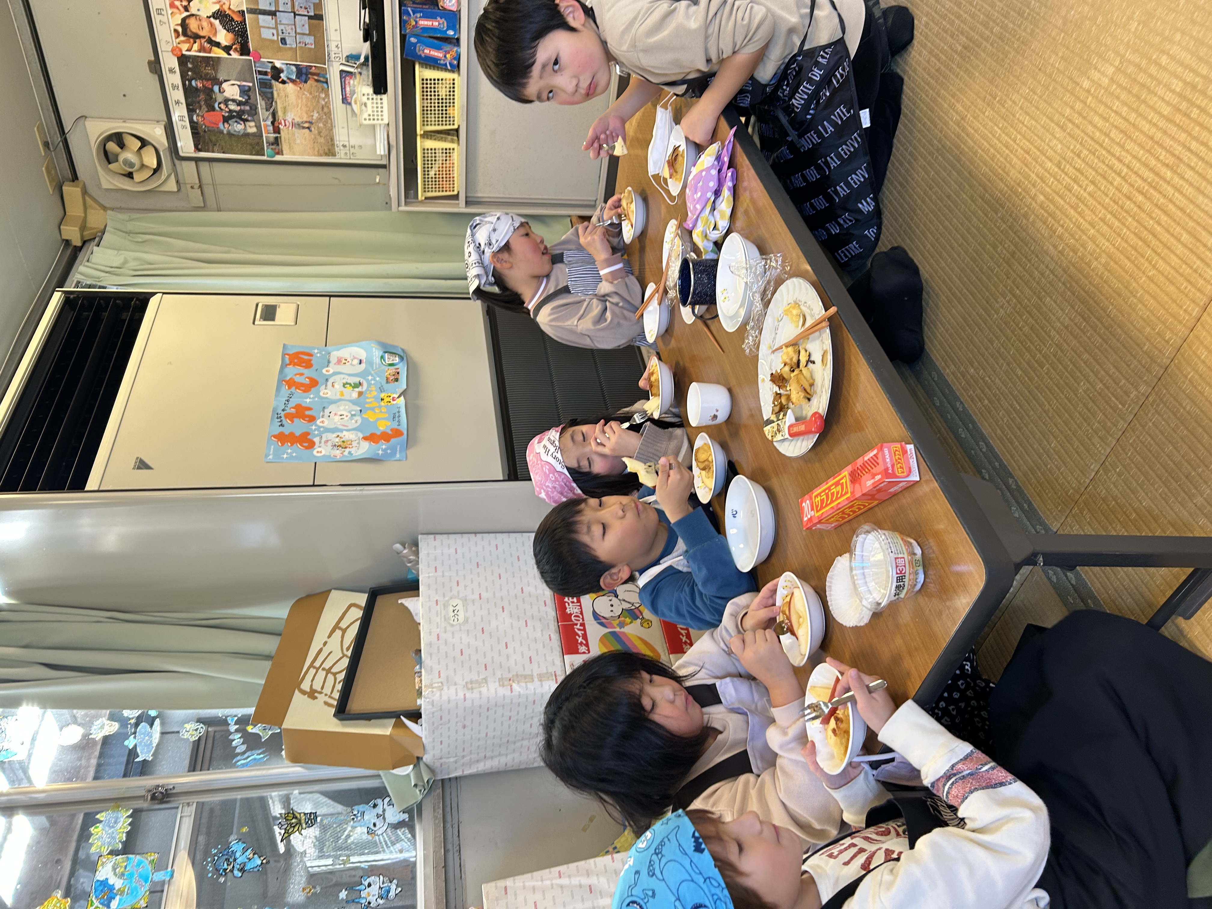 | 余談ですが、サツマイモの芋づるを5歳児さんが皮を剝き、給食の先生に『きんぴら』を作ってもらい、皆で食べました。子ども達は、美味しいと笑顔でパクパク食べており、自分たちの育てや野菜の味は格別のようでした♡ 5歳児さんは、芋づるの皮むきは初めてとのことでしたが、楽しくてお昼寝時間にくい込むほど熱中して作業していました。 | ||