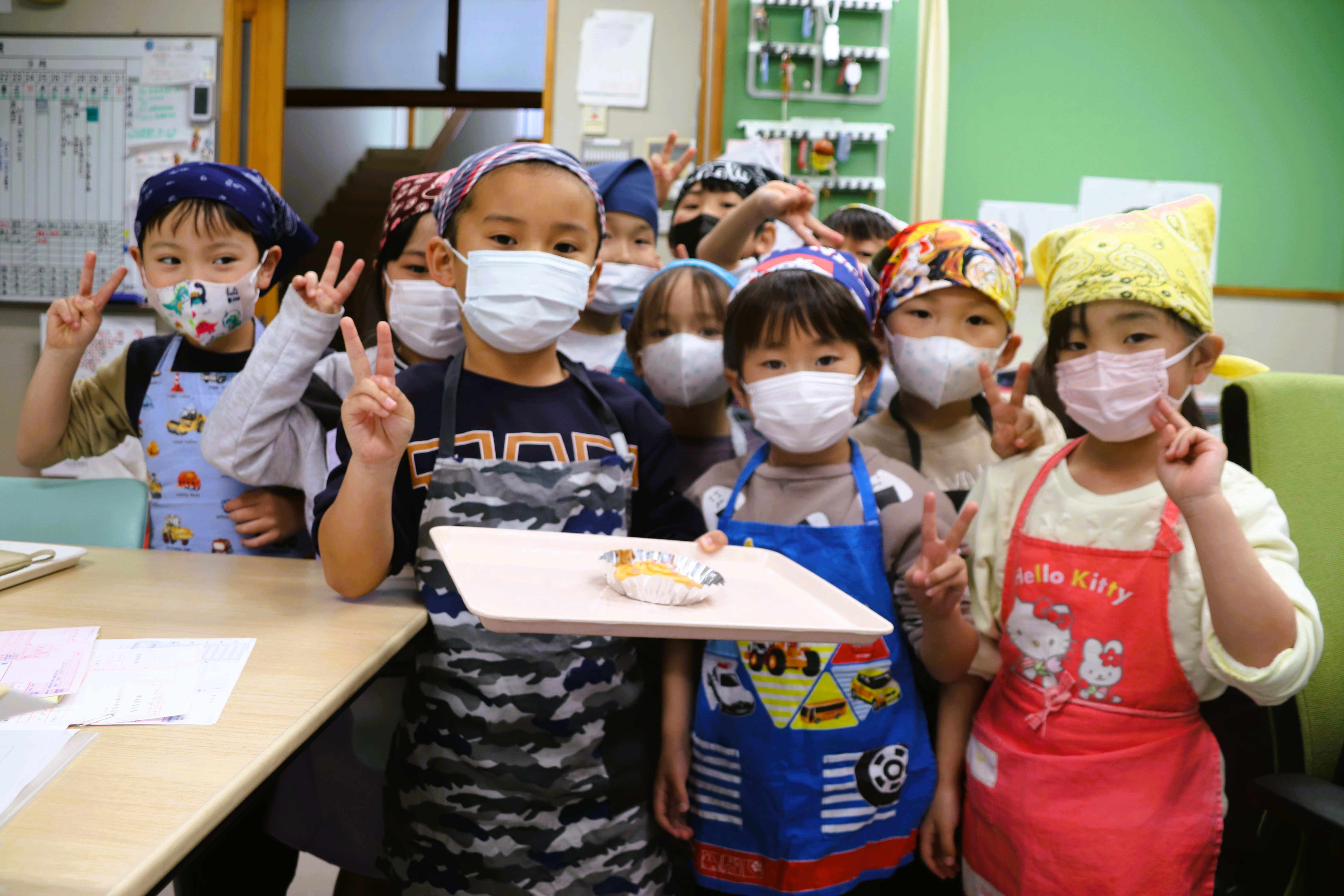 | 今日3月5日(火)5歳児さんは、クッキング保育で全園児分のカップケーキを作りました。焼きあがったケーキにチョコレート等で飾り付けをした可愛い作品がたくさん出来上がりました。とても美味しくて1~4歳児さんも大喜び、尊敬の眼差しで5歳児さん達を見ていました♡ 5歳児さんは、2月26日より就学に向けて『お昼寝』がなくなりました。その時間に本町小学校まで往復4kmを歩いたり、ひらがなの練習をしたり、クッキングをしたり等、小学校入学準備や思い出作りをして過ごしています。 |