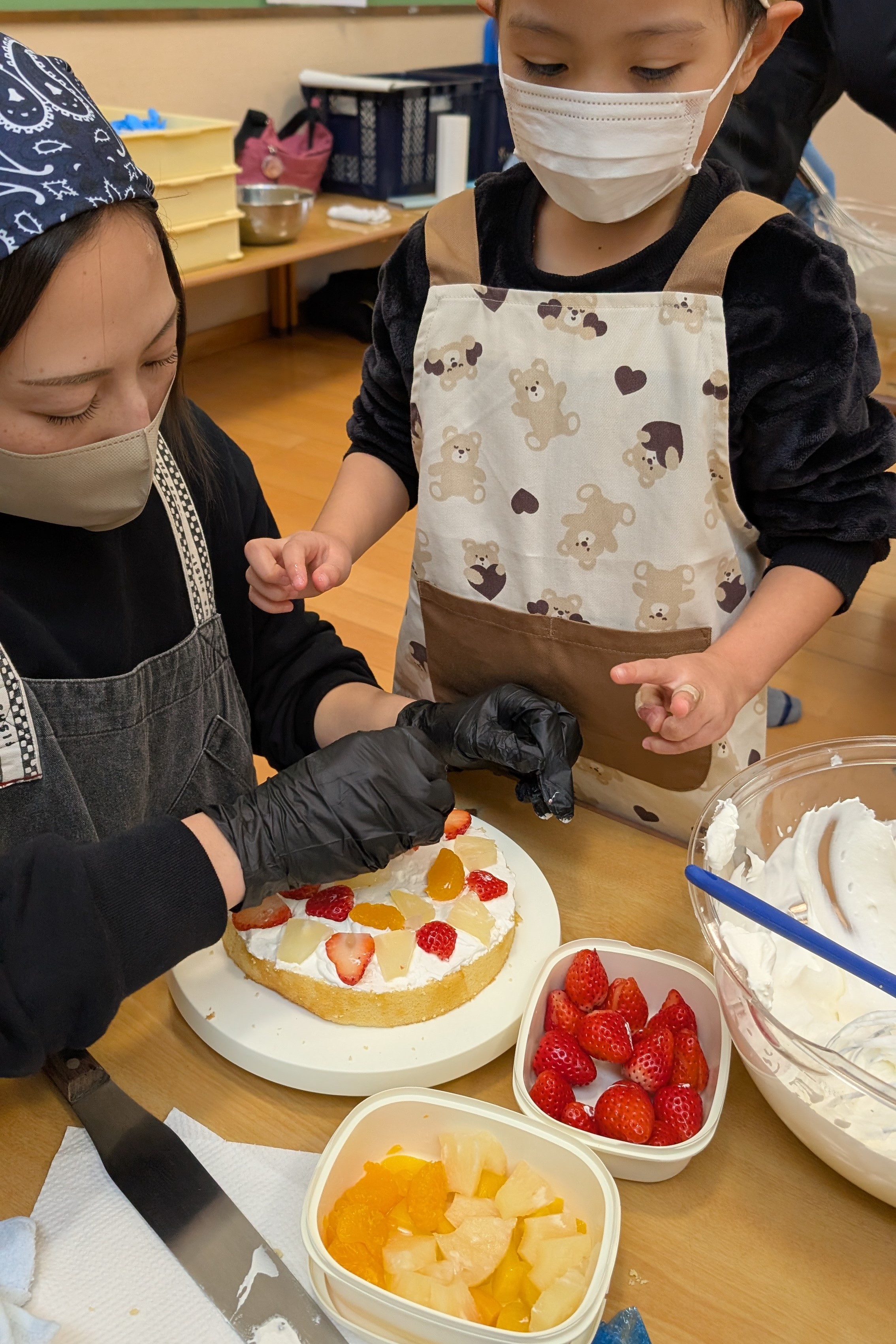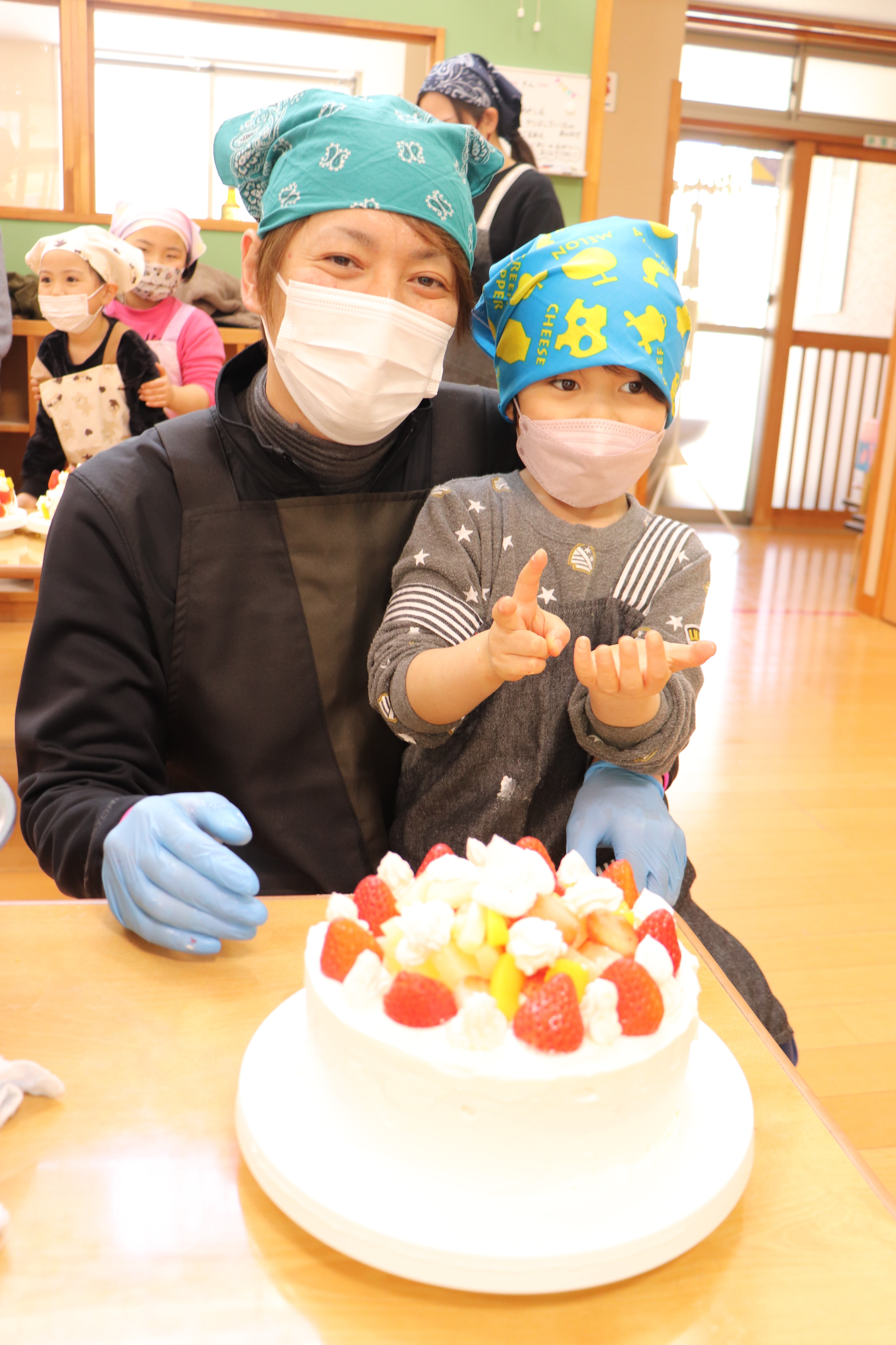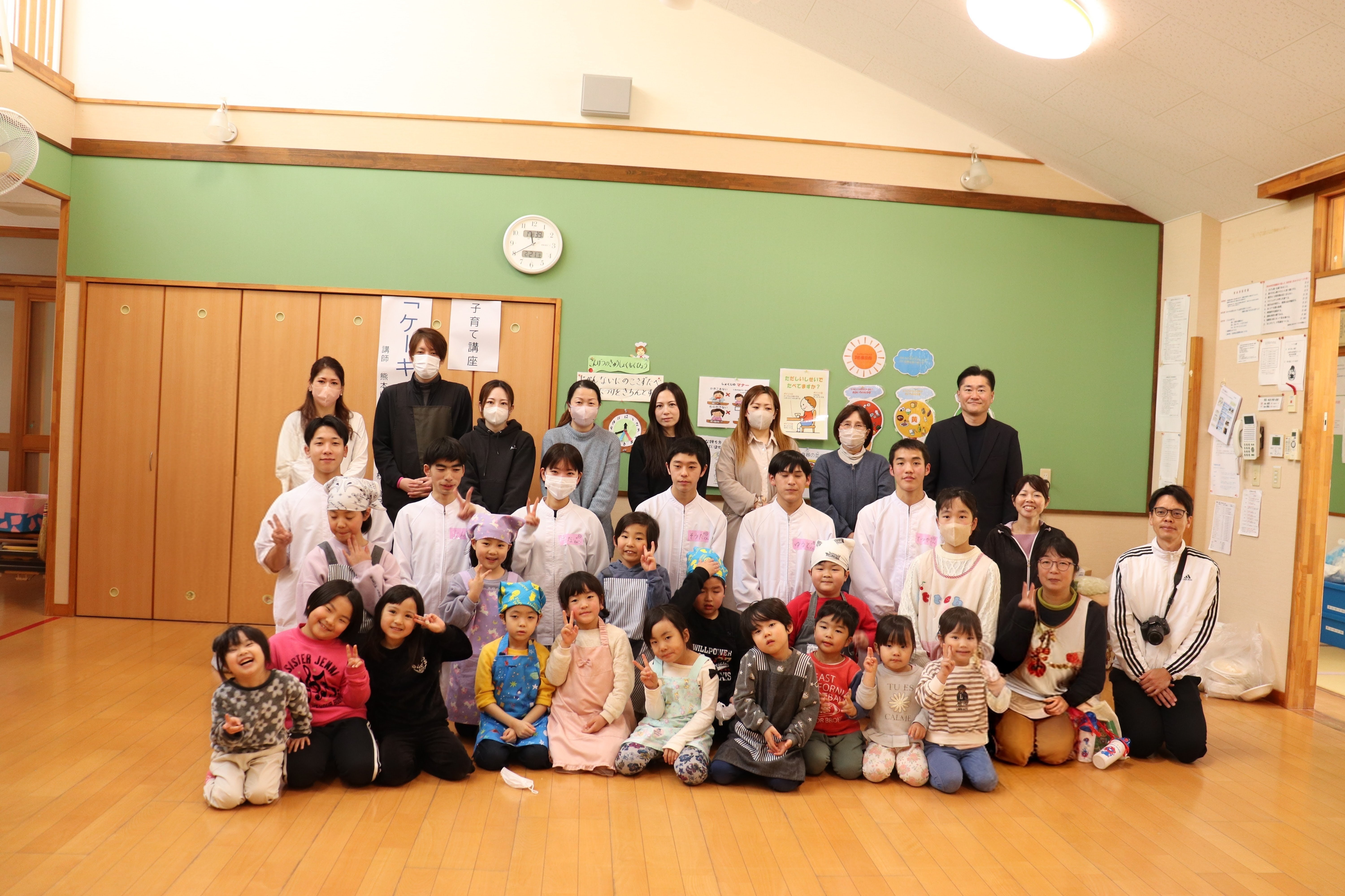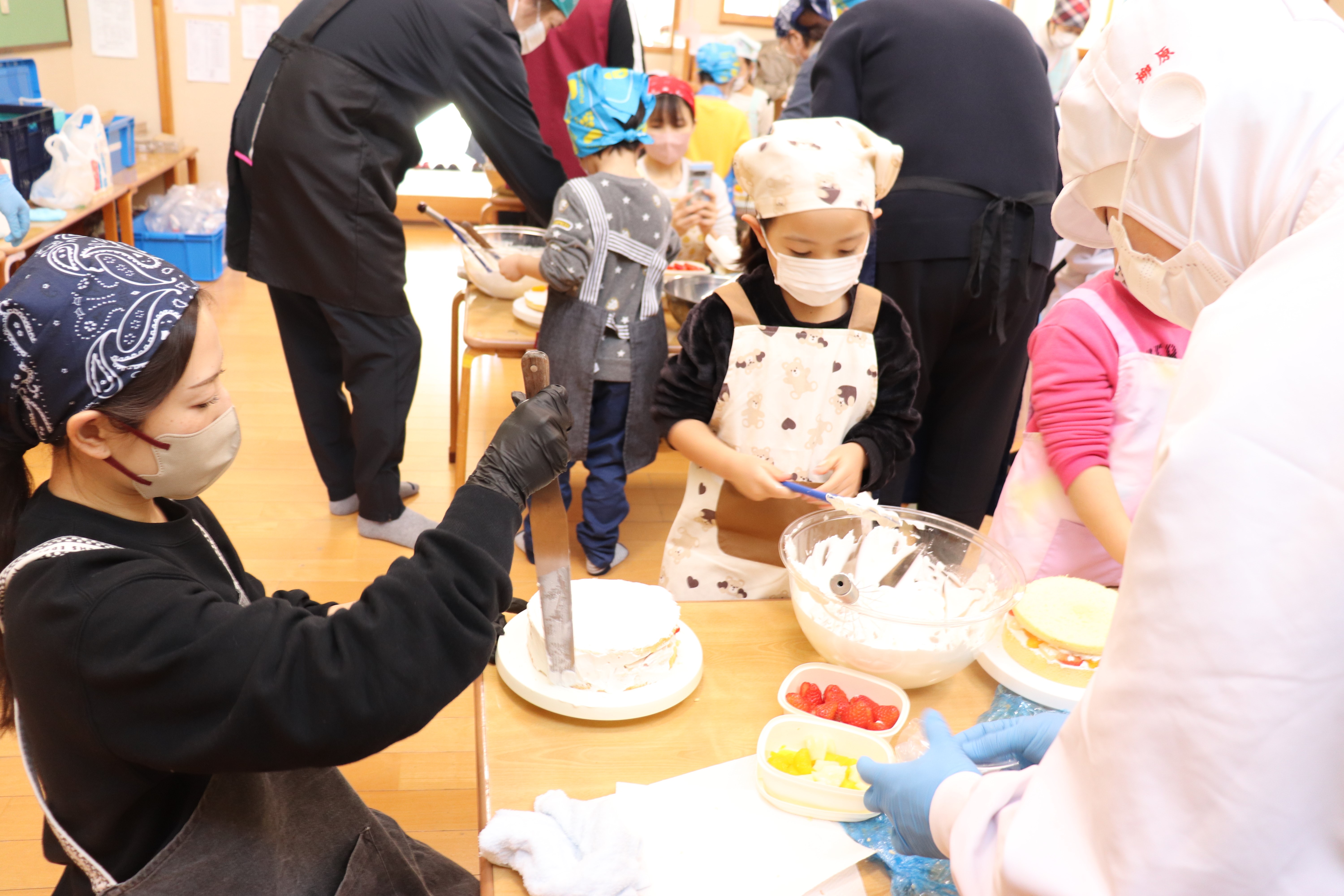 ケーキのスポンジは、事前に学生さんが10ホール焼き上げて持参くださいました。講座では、学生さんから生クリームの泡立て方のコツや、綺麗な塗り方、飾り付けの工夫などを教えていただき、家族で協力し合いながら豪華なショートケーキを完成させました。 完成後は、高校生・教諭・保育園保護者・園児・学童で自分たちで作ったケーキを食べながら茶話会を行いました。自分たちで作ったケーキは格別の美味しさで、大きな口を開けて嬉しそうに食べる園児たちの姿が印象的でした。 また、園児たちは保育園生活では交流することの少ない高校生のお兄さんお姉さんと打ち解け仲良く過ごしていました。どうもパティシエに憧れる子が増えたようです。 拓心高等学校食品科学科の皆様には、休日にもかかわらず来園くださり心より感謝申し上げます。 |