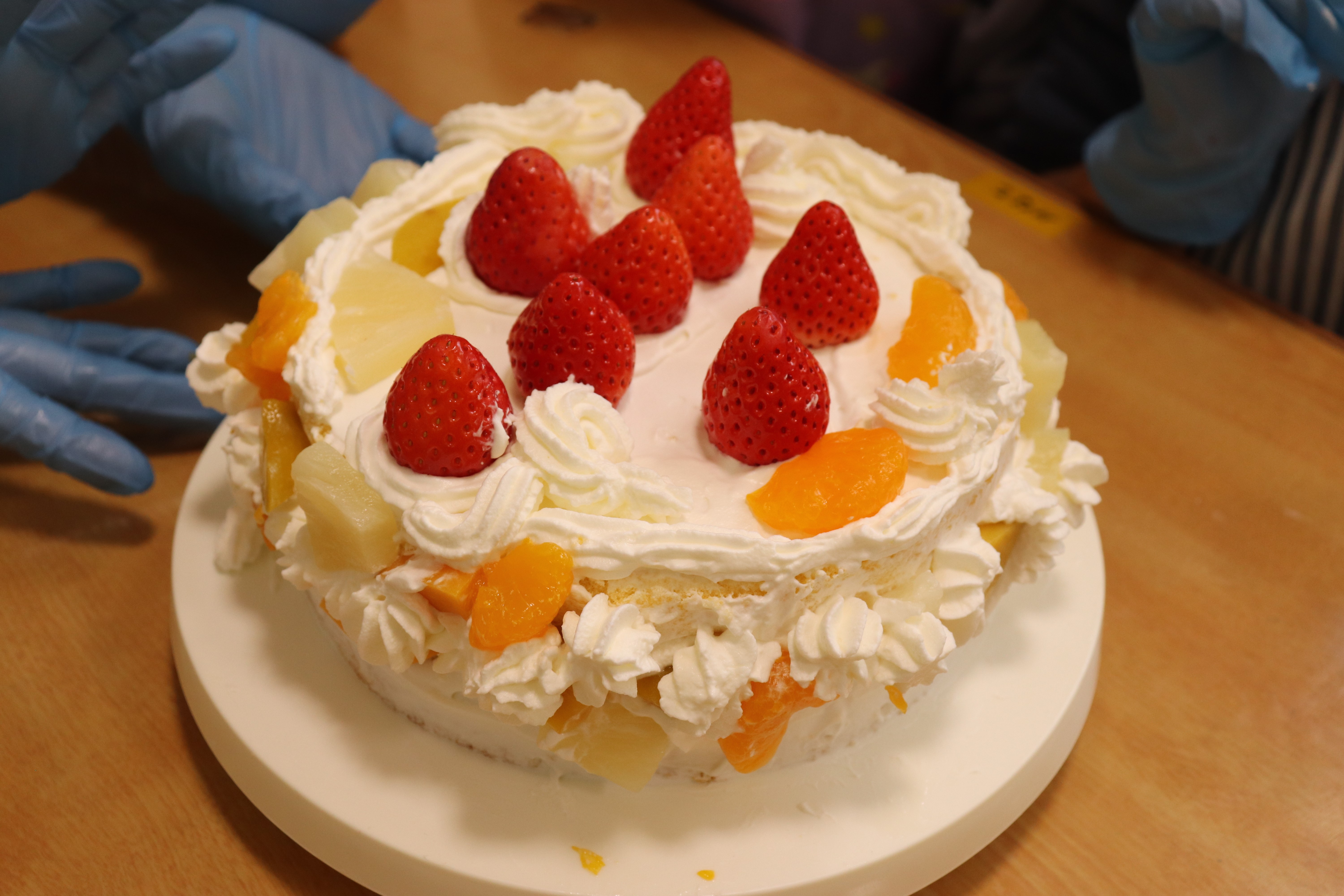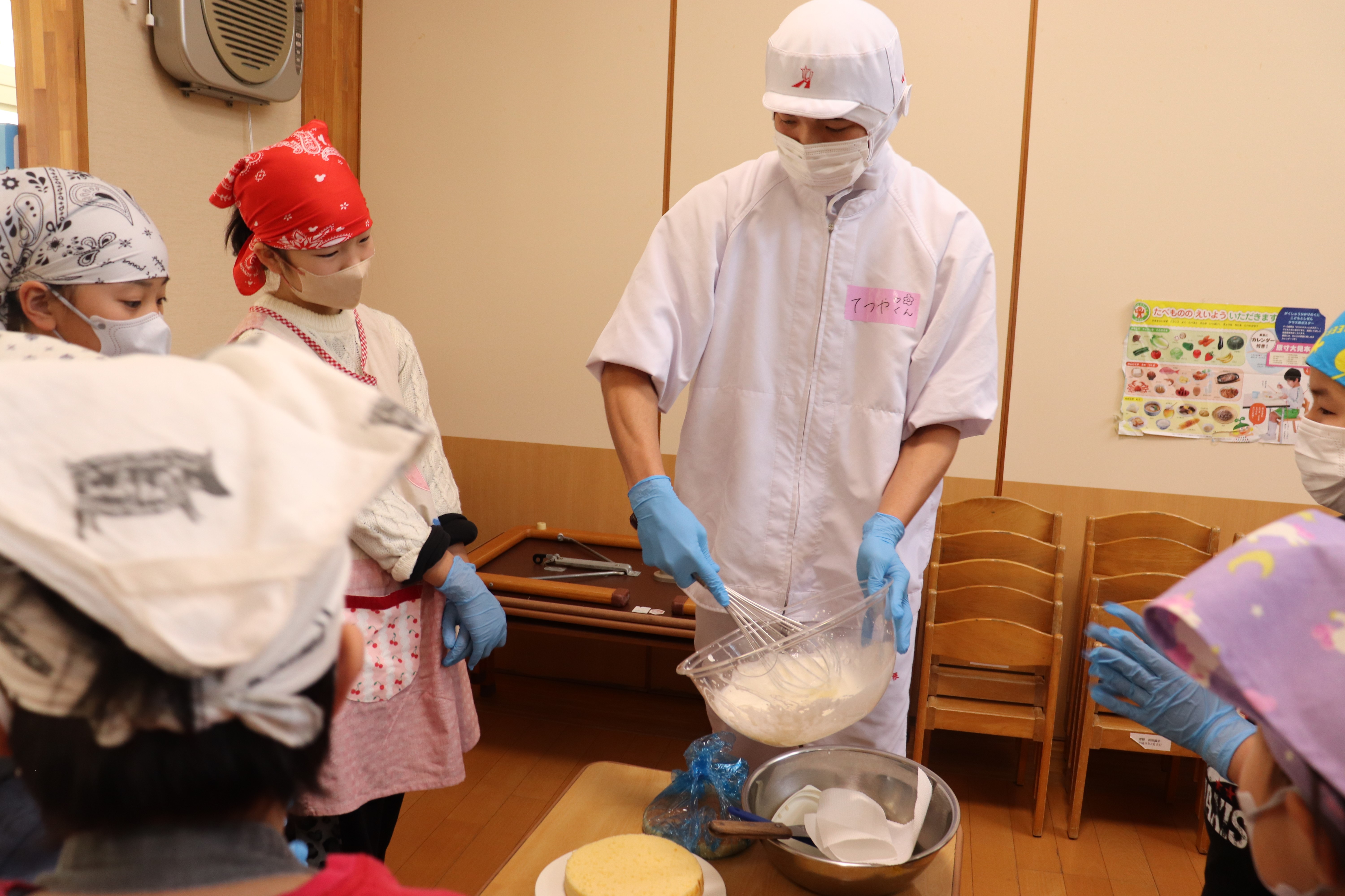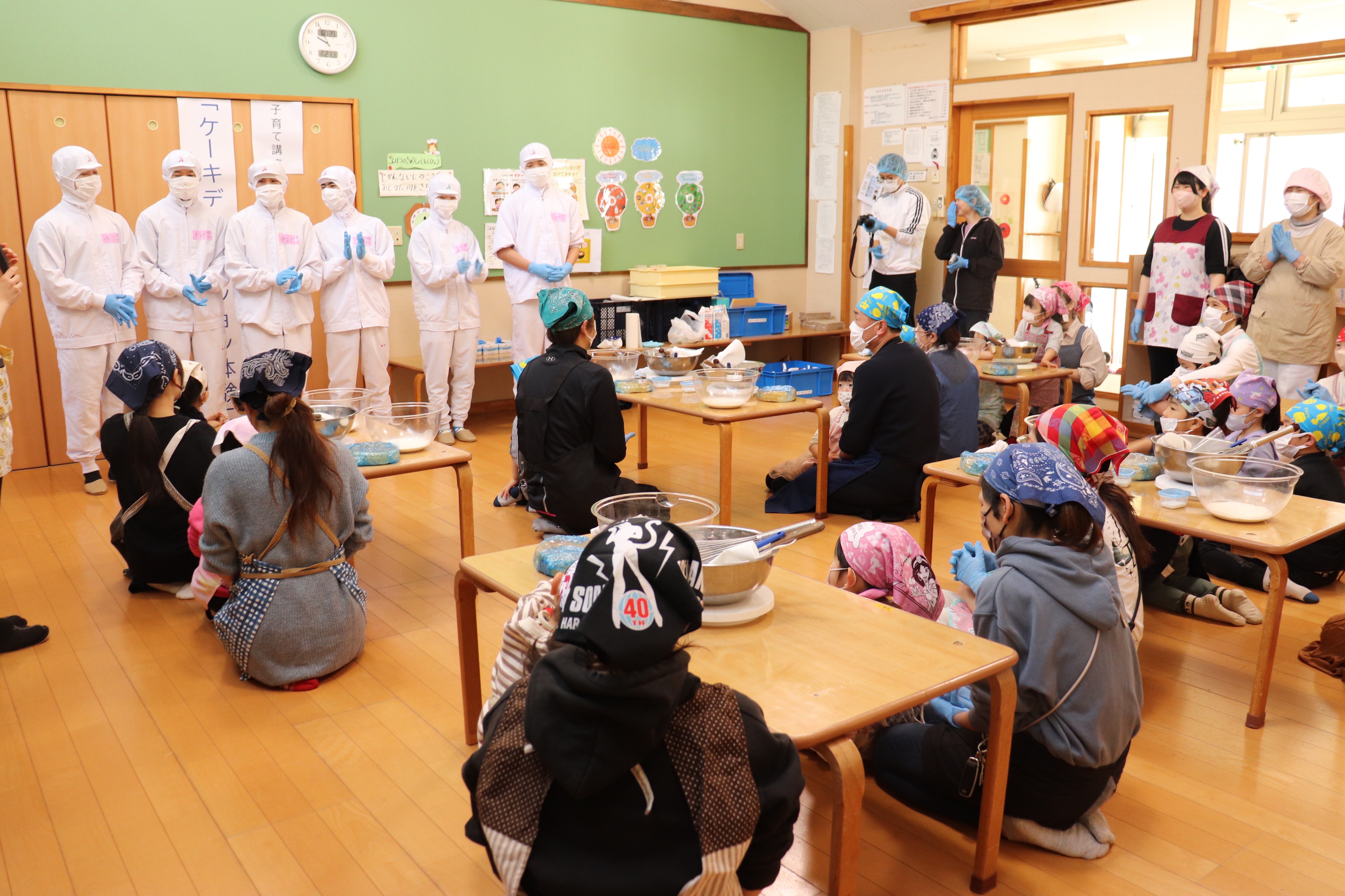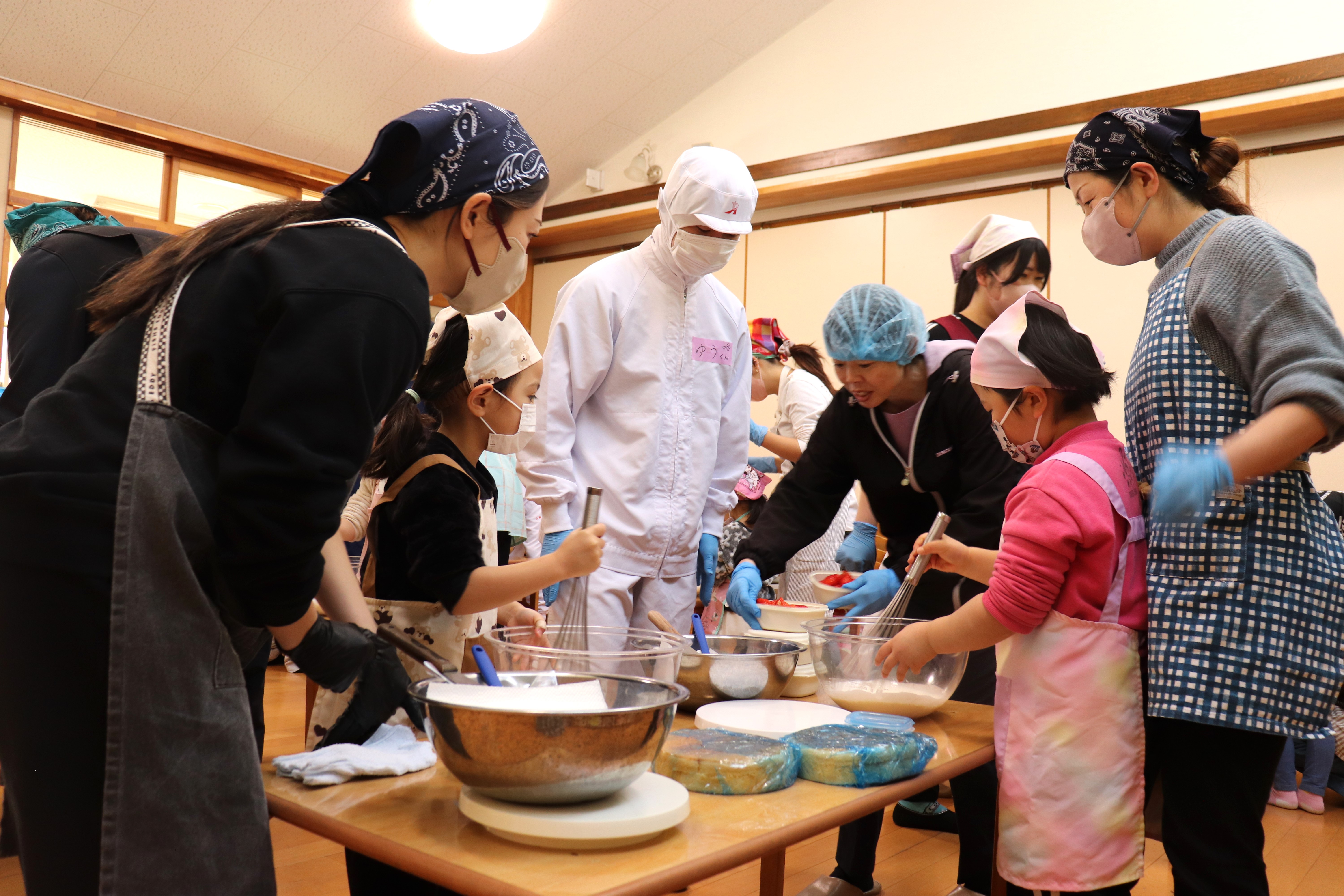 ケーキのスポンジは、事前に学生さんが10ホール焼き上げて持参くださいました。講座では、学生さんから生クリームの泡立て方のコツや、綺麗な塗り方、飾り付けの工夫などを教えていただき、家族で協力し合いながら豪華なショートケーキを完成させました。 完成後は、高校生・教諭・保育園保護者・園児・学童で自分たちで作ったケーキを食べながら茶話会を行いました。自分たちで作ったケーキは格別の美味しさで、大きな口を開けて嬉しそうに食べる園児たちの姿が印象的でした。 また、園児たちは保育園生活では交流することの少ない高校生のお兄さんお姉さんと打ち解け仲良く過ごしていました。どうもパティシエに憧れる子が増えたようです。 拓心高等学校食品科学科の皆様には、休日にもかかわらず来園くださり心より感謝申し上げます。 |