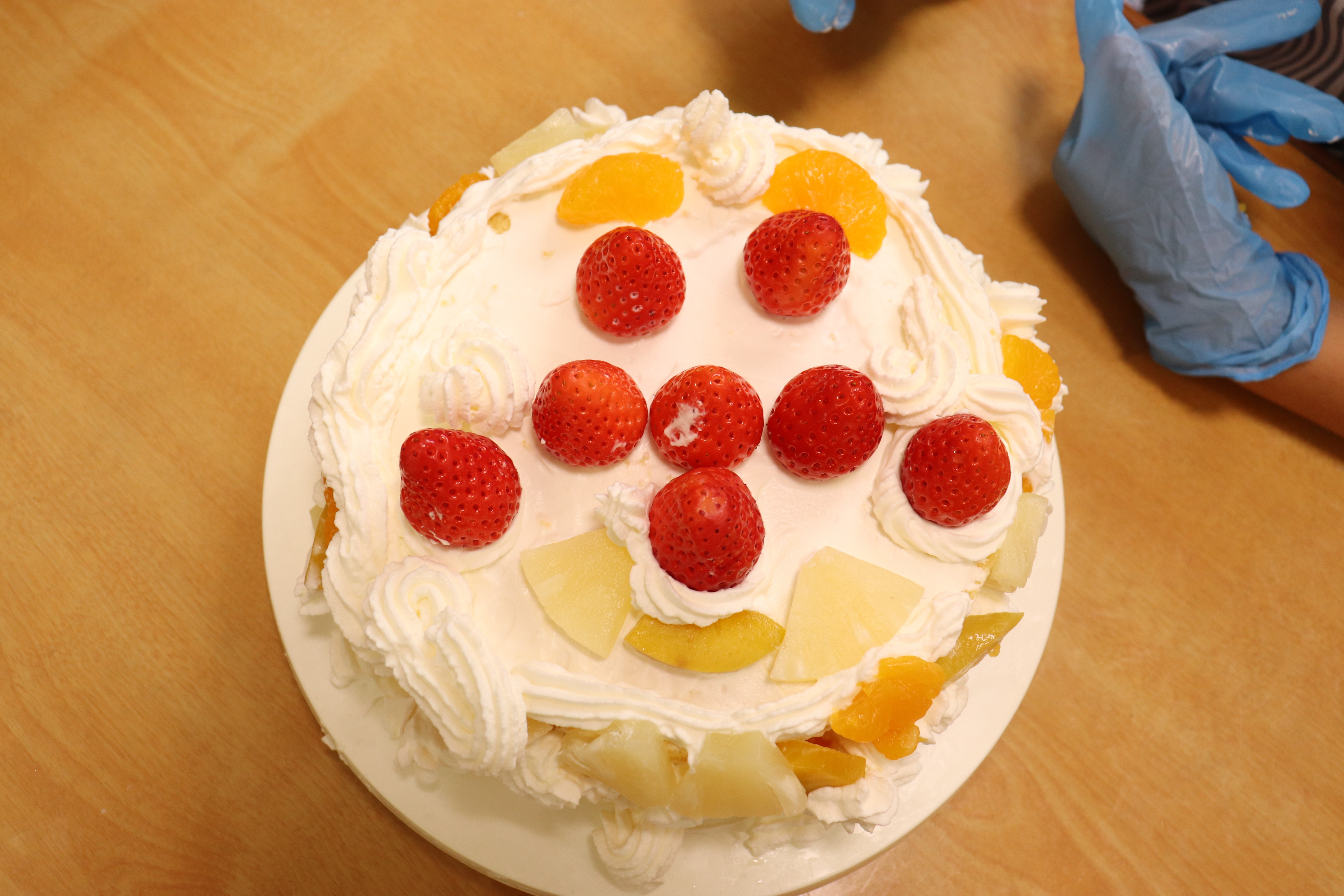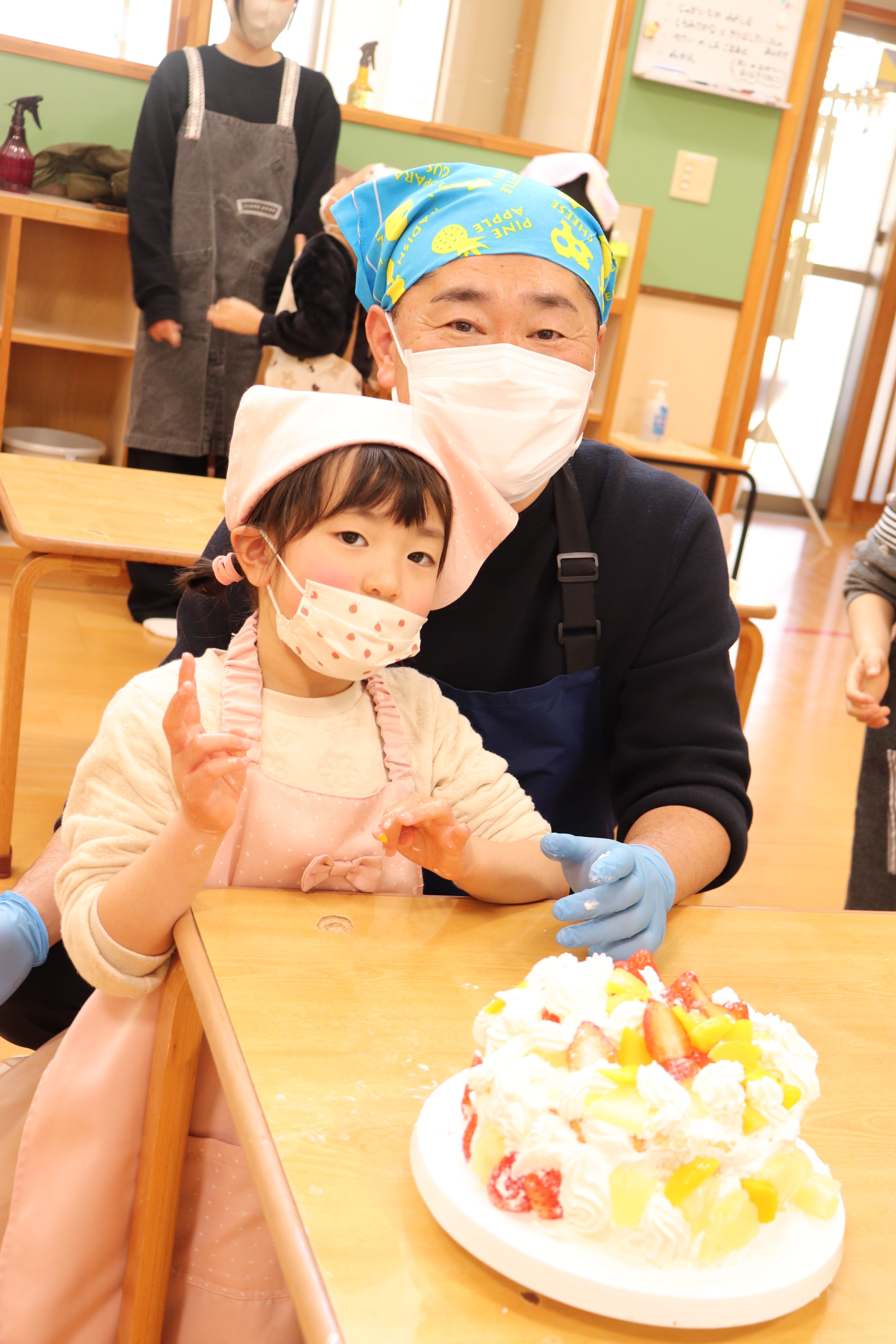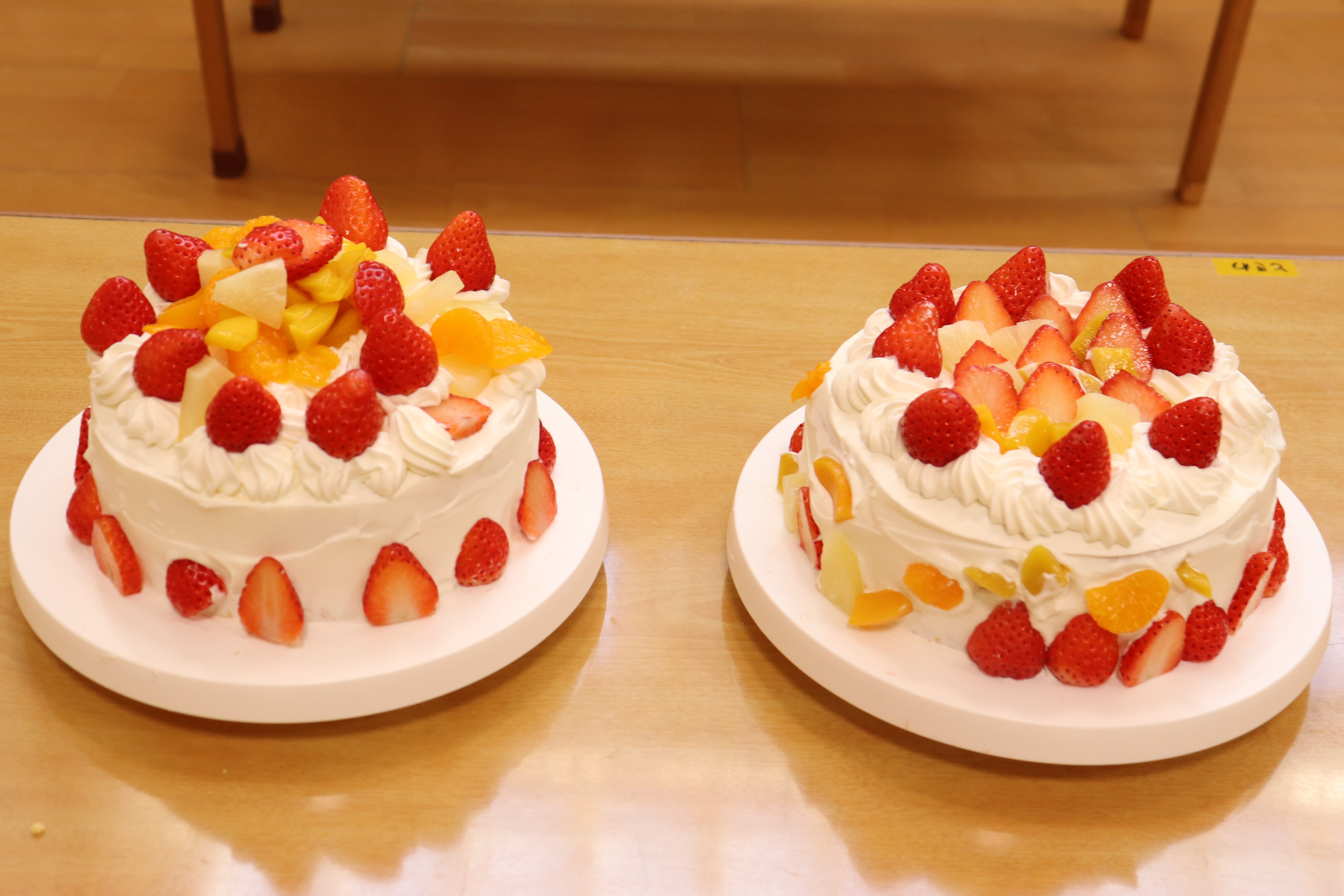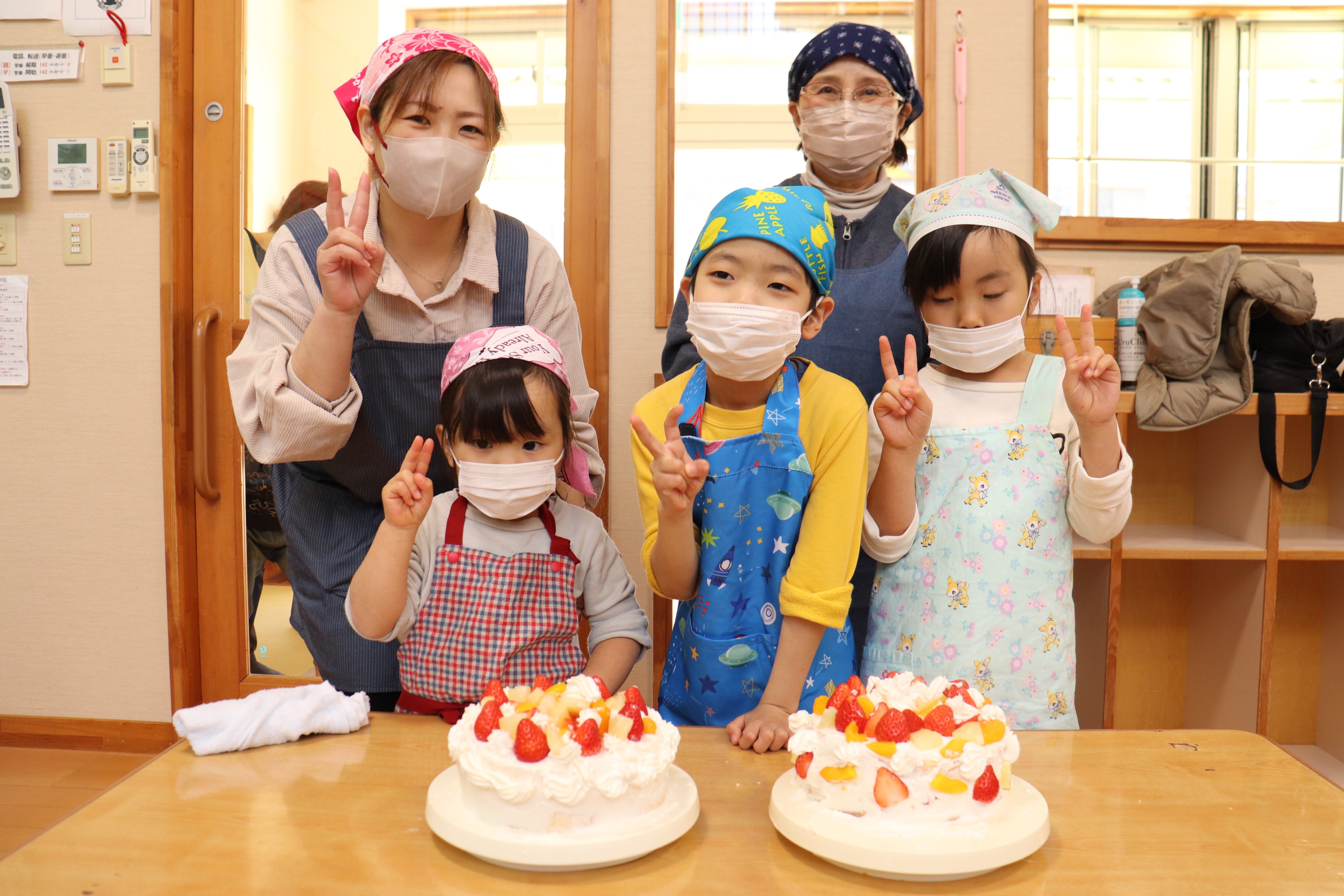 ケーキのスポンジは、事前に学生さんが10ホール焼き上げて持参くださいました。講座では、学生さんから生クリームの泡立て方のコツや、綺麗な塗り方、飾り付けの工夫などを教えていただき、家族で協力し合いながら豪華なショートケーキを完成させました。 完成後は、高校生・教諭・保育園保護者・園児・学童で自分たちで作ったケーキを食べながら茶話会を行いました。自分たちで作ったケーキは格別の美味しさで、大きな口を開けて嬉しそうに食べる園児たちの姿が印象的でした。 また、園児たちは保育園生活では交流することの少ない高校生のお兄さんお姉さんと打ち解け仲良く過ごしていました。どうもパティシエに憧れる子が増えたようです。 拓心高等学校食品科学科の皆様には、休日にもかかわらず来園くださり心より感謝申し上げます。 |