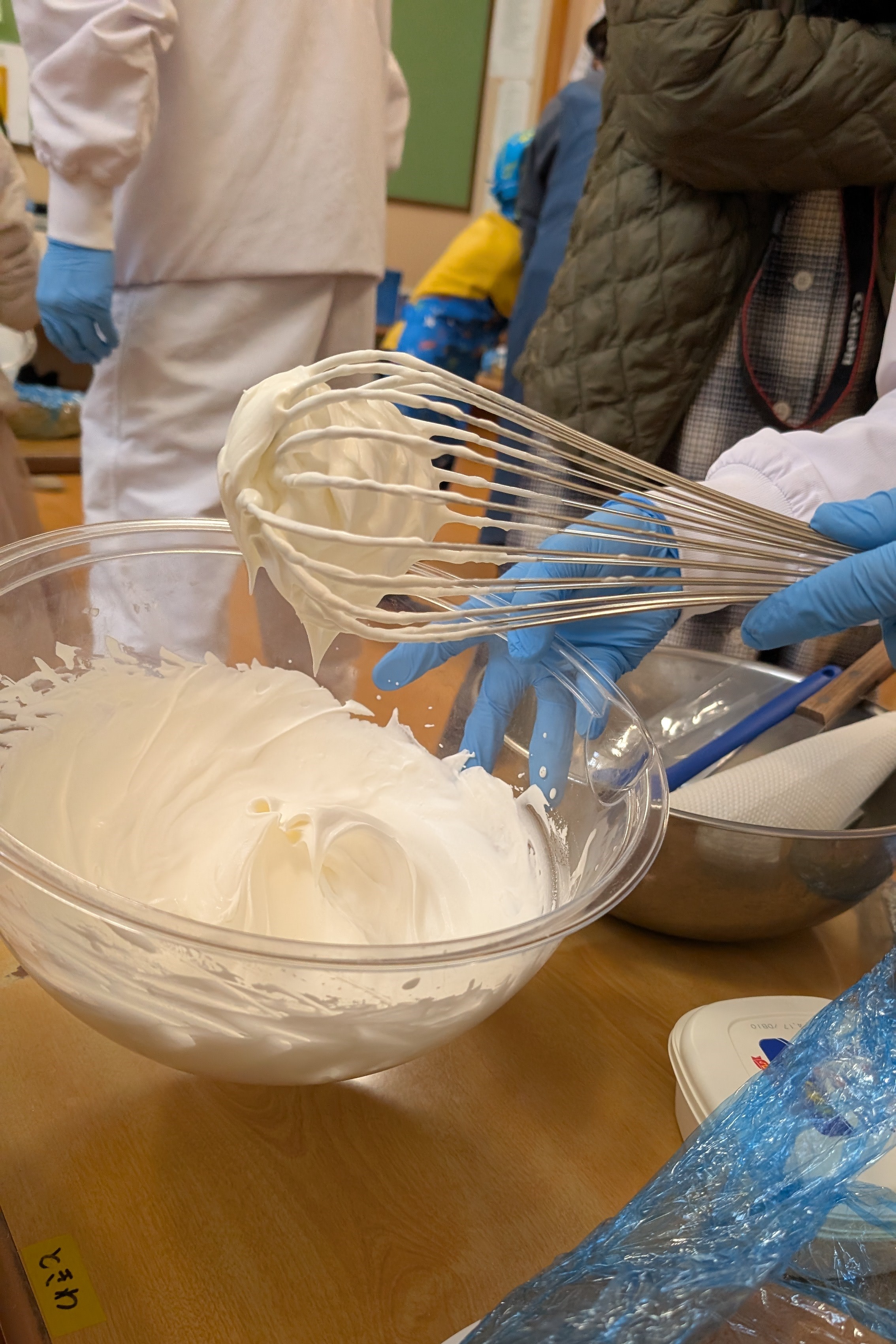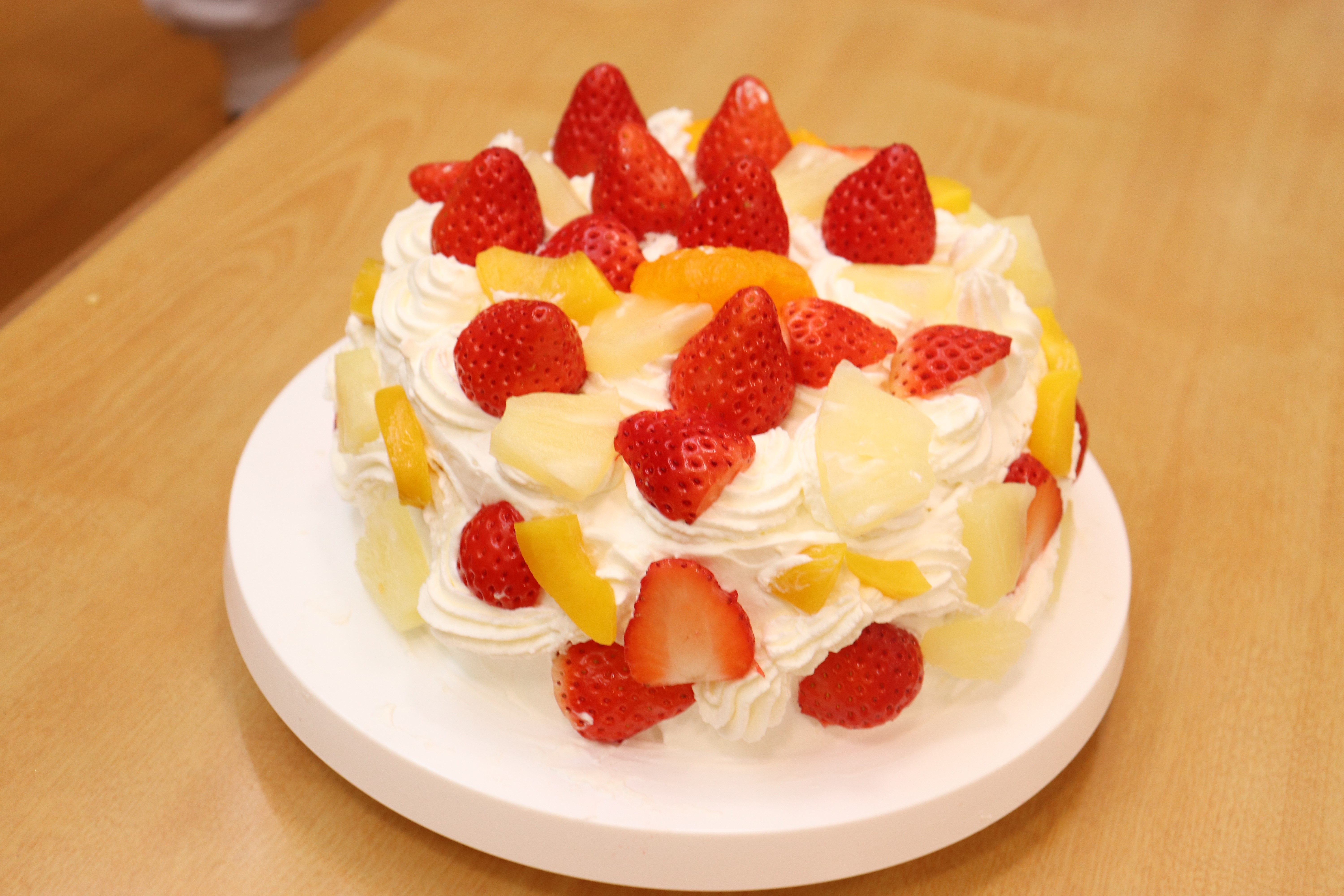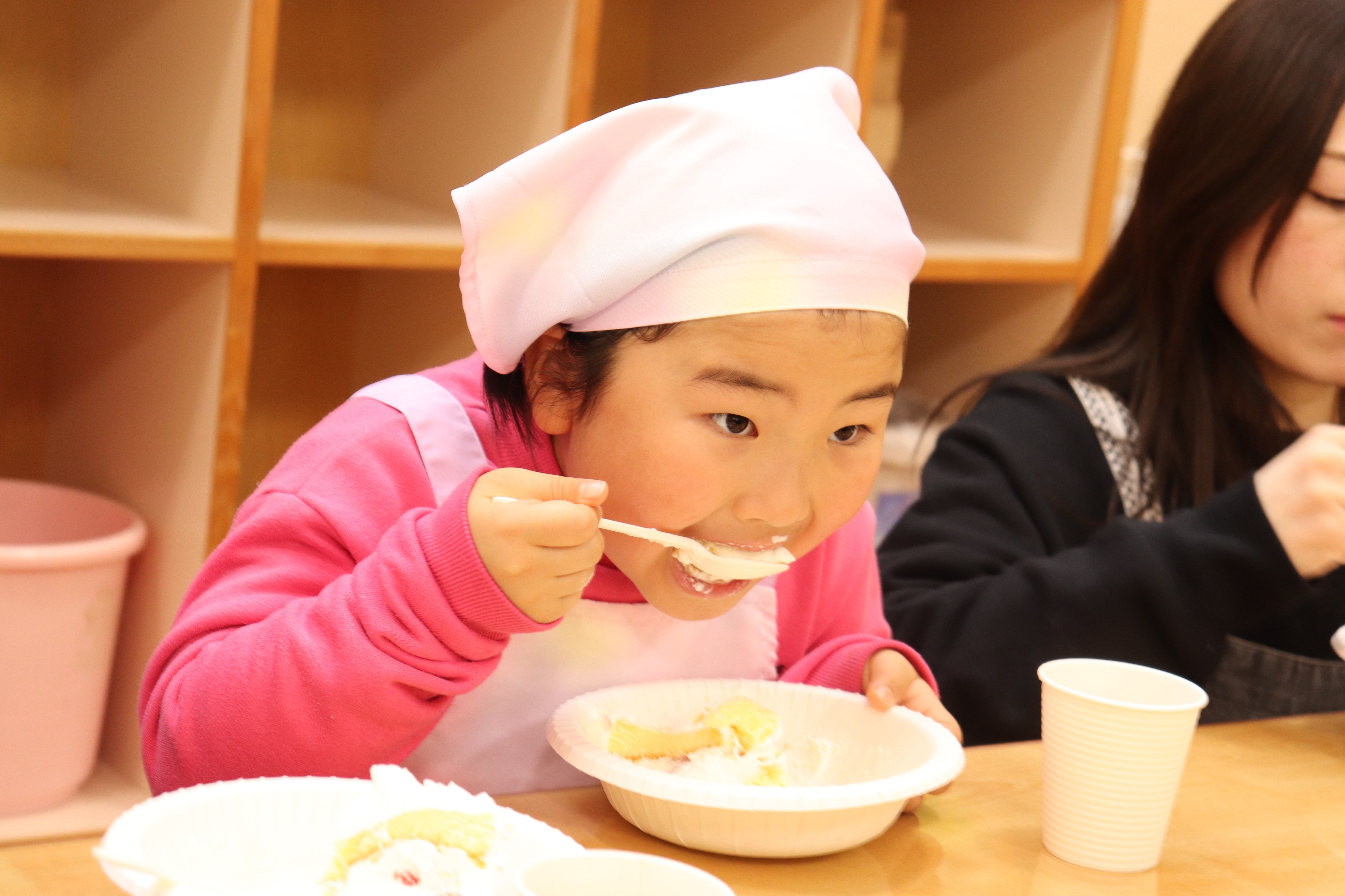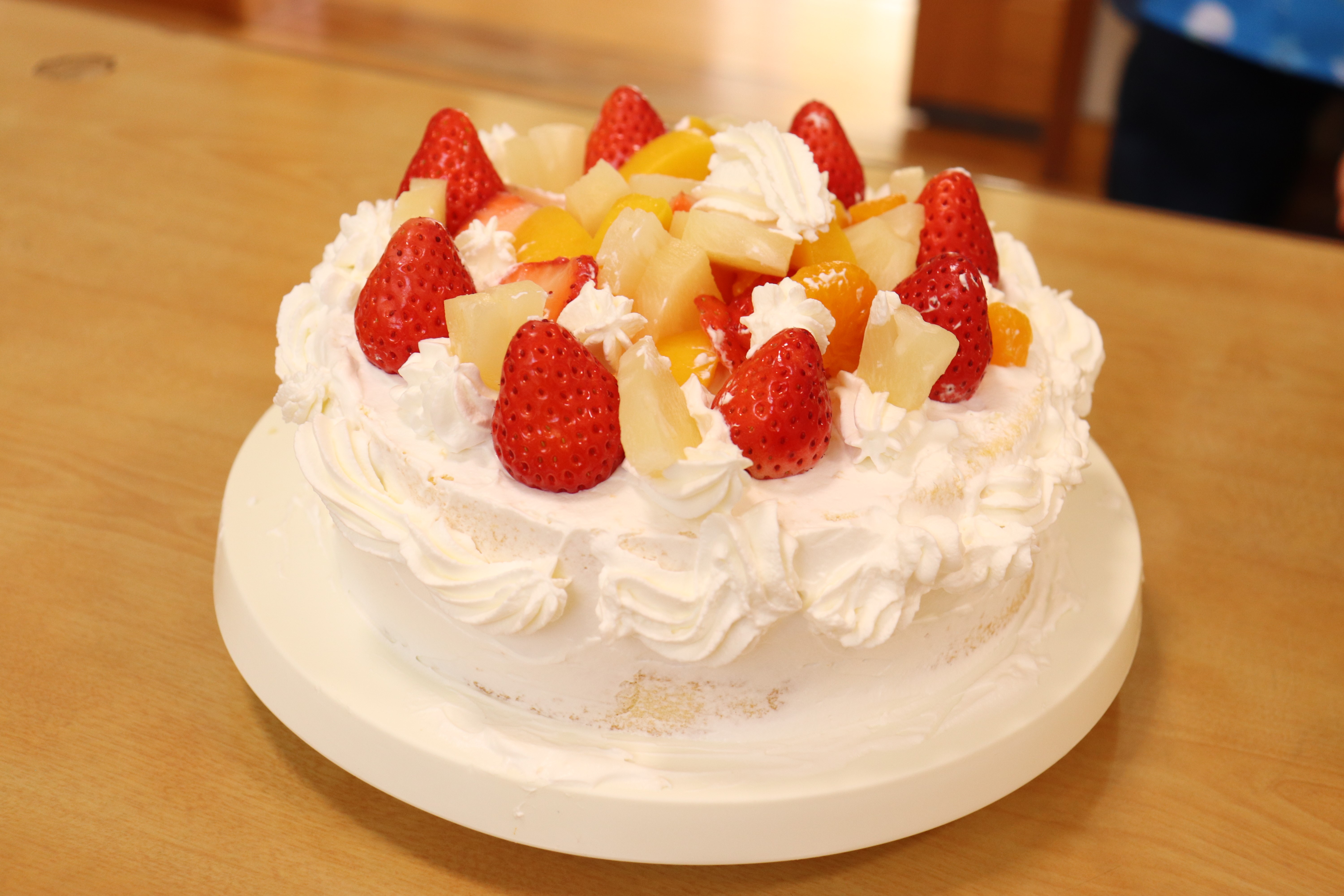ケーキのスポンジは、事前に学生さんが10ホール焼き上げて持参くださいました。講座では、学生さんから生クリームの泡立て方のコツや、綺麗な塗り方、飾り付けの工夫などを教えていただき、家族で協力し合いながら豪華なショートケーキを完成させました。 完成後は、高校生・教諭・保育園保護者・園児・学童で自分たちで作ったケーキを食べながら茶話会を行いました。自分たちで作ったケーキは格別の美味しさで、大きな口を開けて嬉しそうに食べる園児たちの姿が印象的でした。 また、園児たちは保育園生活では交流することの少ない高校生のお兄さんお姉さんと打ち解け仲良く過ごしていました。どうもパティシエに憧れる子が増えたようです。 拓心高等学校食品科学科の皆様には、休日にもかかわらず来園くださり心より感謝申し上げます。 |