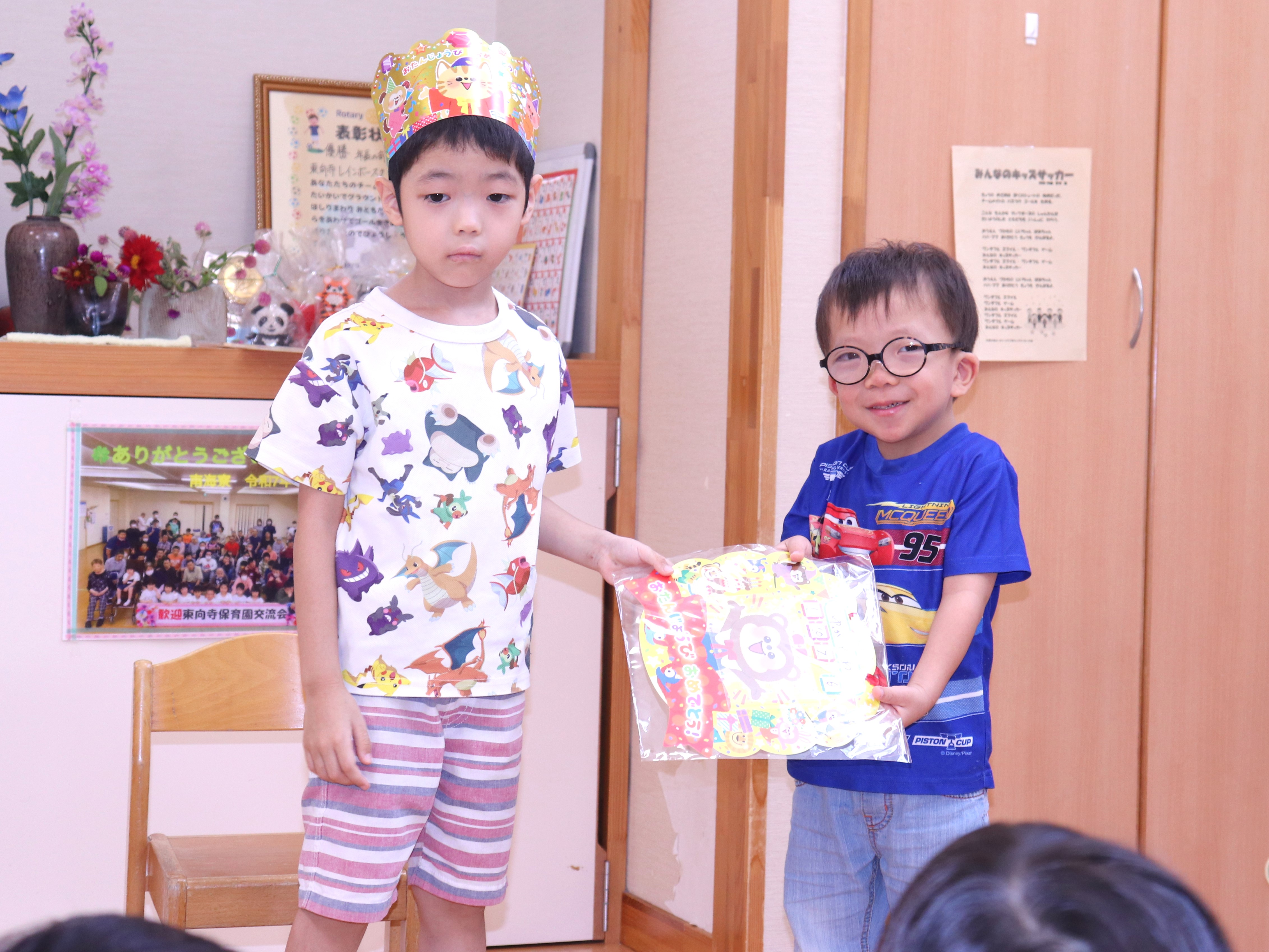 | 8月19日(火)8月生まれのお誕生会を行いました。8月生まれのお友だち、お誕生日おめでとうございます♡ 子ども達がインタビューに答える様子を見ていて、一年前の誕生会を思い出し懐かしんだり、ハキハキと答える姿に成長を感じたりと、感無量でした。 誕生会後の会食にもお家の方がも参加してくださり、楽しいお誕生会になりました。保護者の皆様、ありがとうございました。 当園では、お誕生会に保護者の皆様をお呼びしています。保育園での子どもさんの様子をご覧いただいたり、子ども達と同じ給食を食べていただいたるする機会としています。お仕事の都合が付きましたなら、ご参加ください。 |