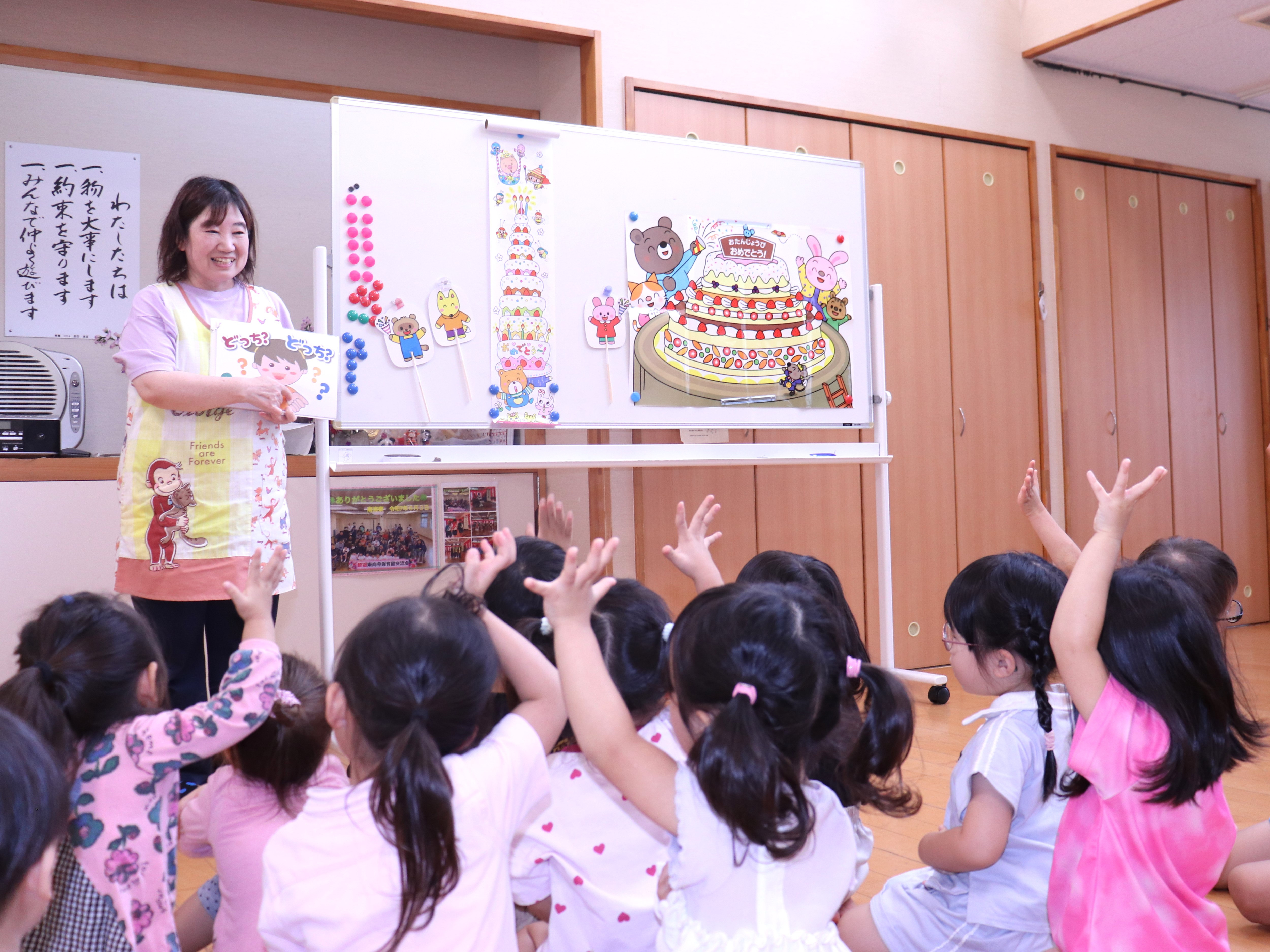 | 7月15日(火)7月生れのお友だちのお誕生会が開催されました。7月生れのお友だち、お誕生日おめでとうございます♡ 蝉のなき声が聞こえる中、お家の方やお友達からお祝いをされ、照れながらも嬉しそうな子ども達の様子が印象的でした。 |