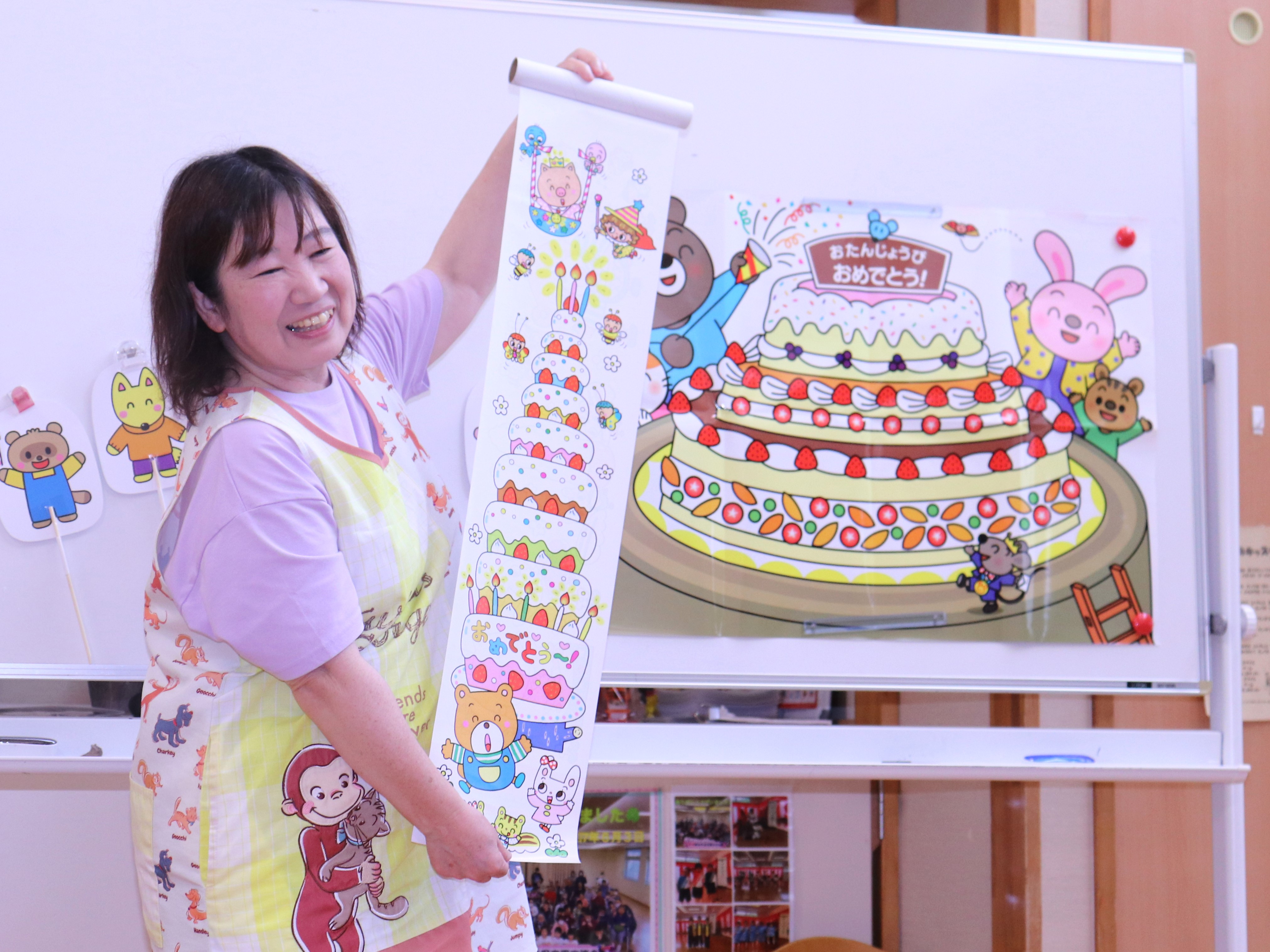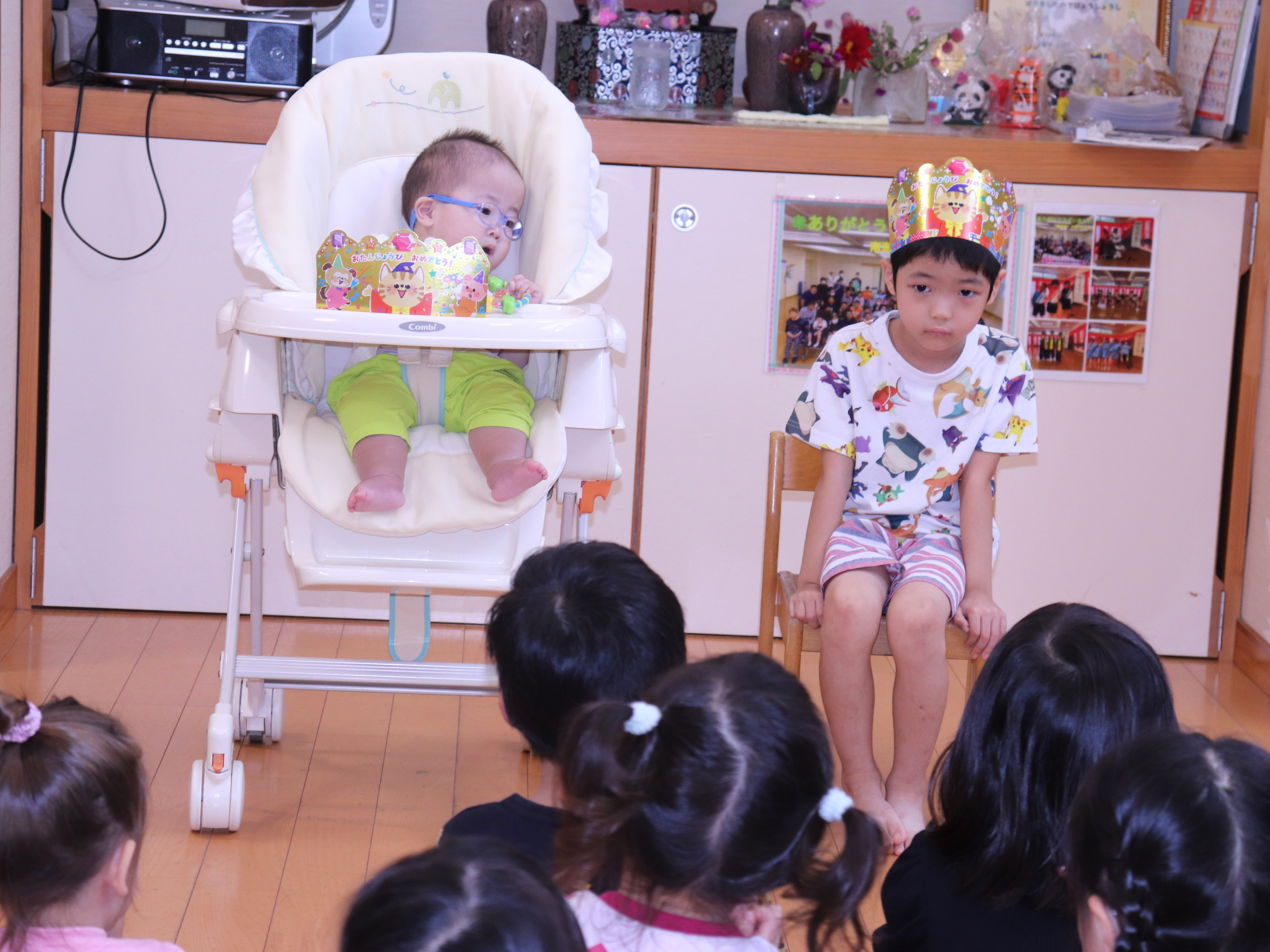 | 6月17日(火)6月生れのお誕生会が開催されました。6月生まれのお友だちお誕生日おめでとうございます♡ 誕生月の子ども達は、緊張しながらもお家の方やお友達から歌やメッセージ・誕生カードのプレゼントをいただき嬉しそうに過ごしていました。 特にお家の方からのお祝いメッセージでは、出産時の様子や保育園で見せていない得意な事・お手伝いの様子等が分かり感動したり、新たな一面が発見できたり…で皆、楽しみにしています。 |