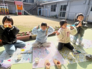 | 買い物の後は、保育園まで戻り東向寺の境内で楽しみにしていたお弁当タイム。お弁当を食べるというだけで徒歩の疲れも吹き飛んだ子ども達でした。 | ||