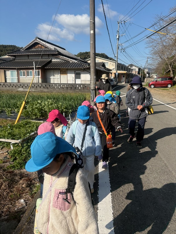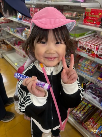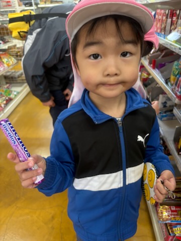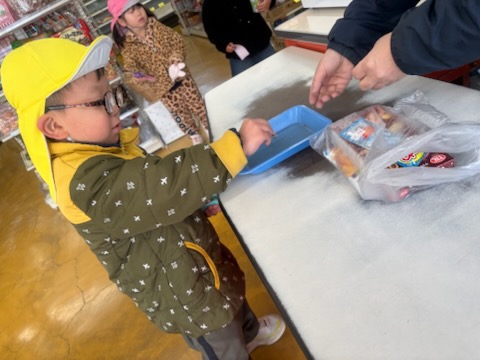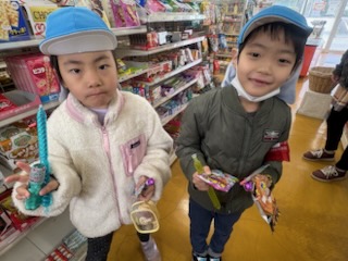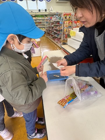 | 今年度のお別れ遠足のミッションは、『算数って何だろう』で学んだお金の数え方を生かし買物をすることです。各自のお財布に4・5歳児さんは300円、3歳児さんは200円を入れて臨みました。 机上では、上手に買い物ができる子ども達ですが、実際になるとお財布から小銭を出すだけでも難しい…貴重な体験ができました。無事に買い物を終え帰路に。往復3km、途中ダラダラとした坂道も頑張って歩きました。 |